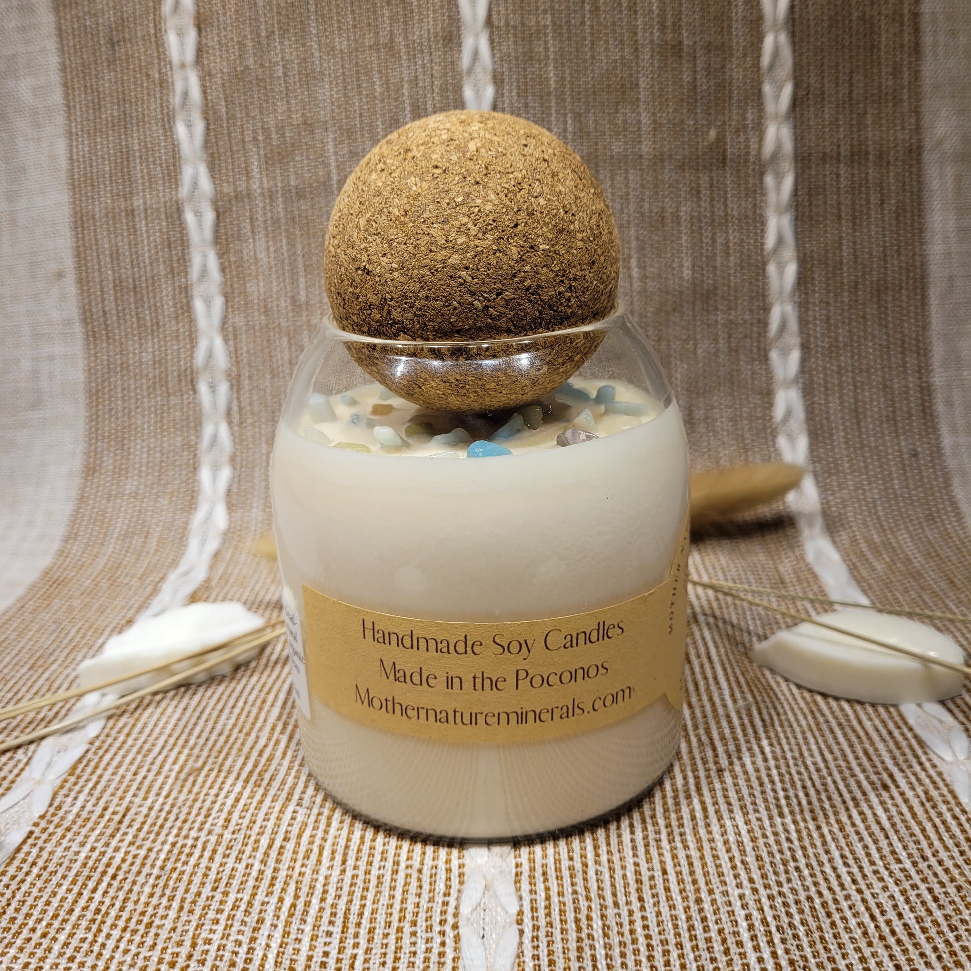 Handmade soy candles created with high-quality clean burning essential oil infused fragrance, 100% cotton wick, lead free borosilicate glass jar, natural cork lid, decorated with organic dried herbs and ethically sourced crystals in a 17 oz jar. Plus there is a hidden crystal on the bottom!