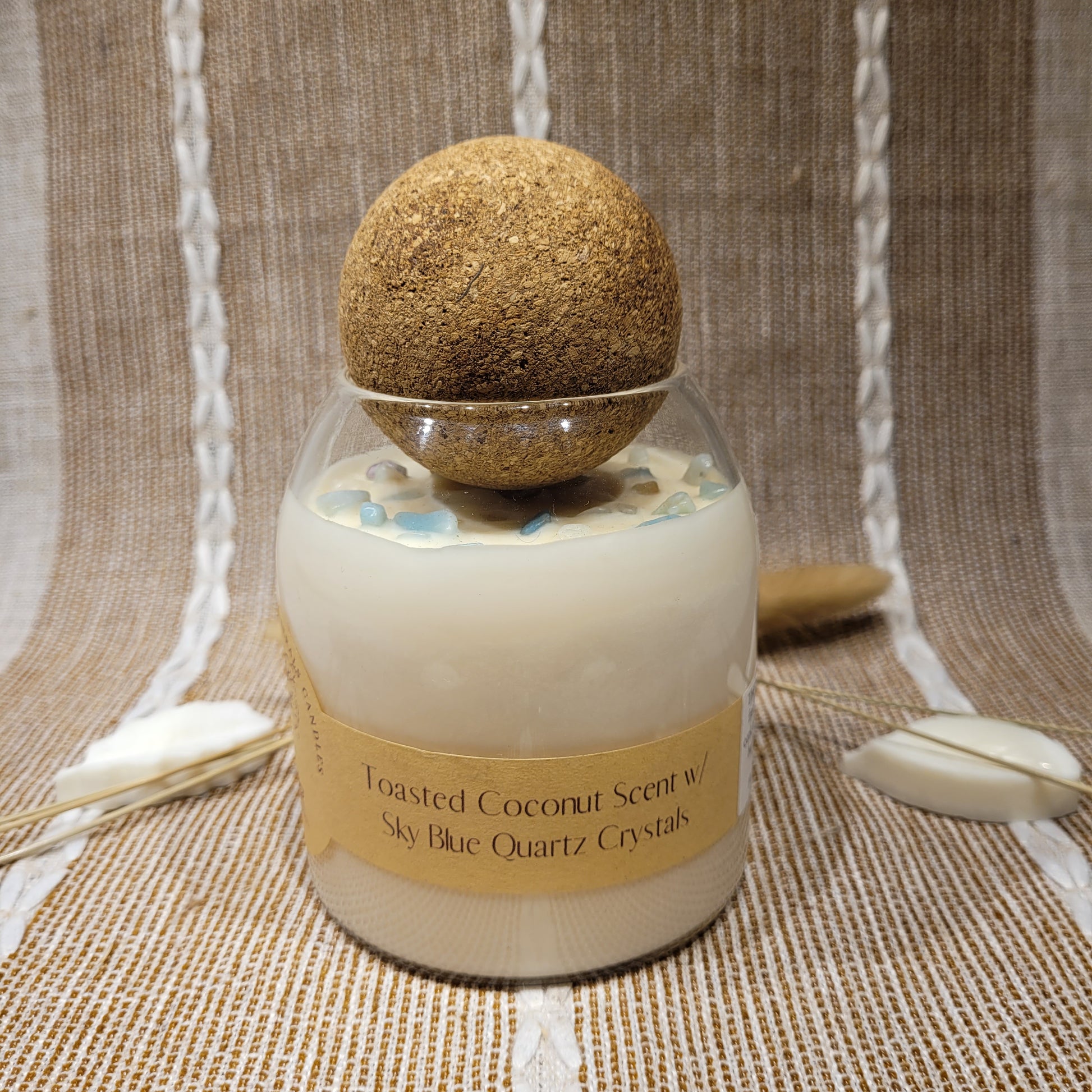 This candle has a lovely Toasted Coconut scent and is decorated with Sky Blue Quartz crystal chips on top!