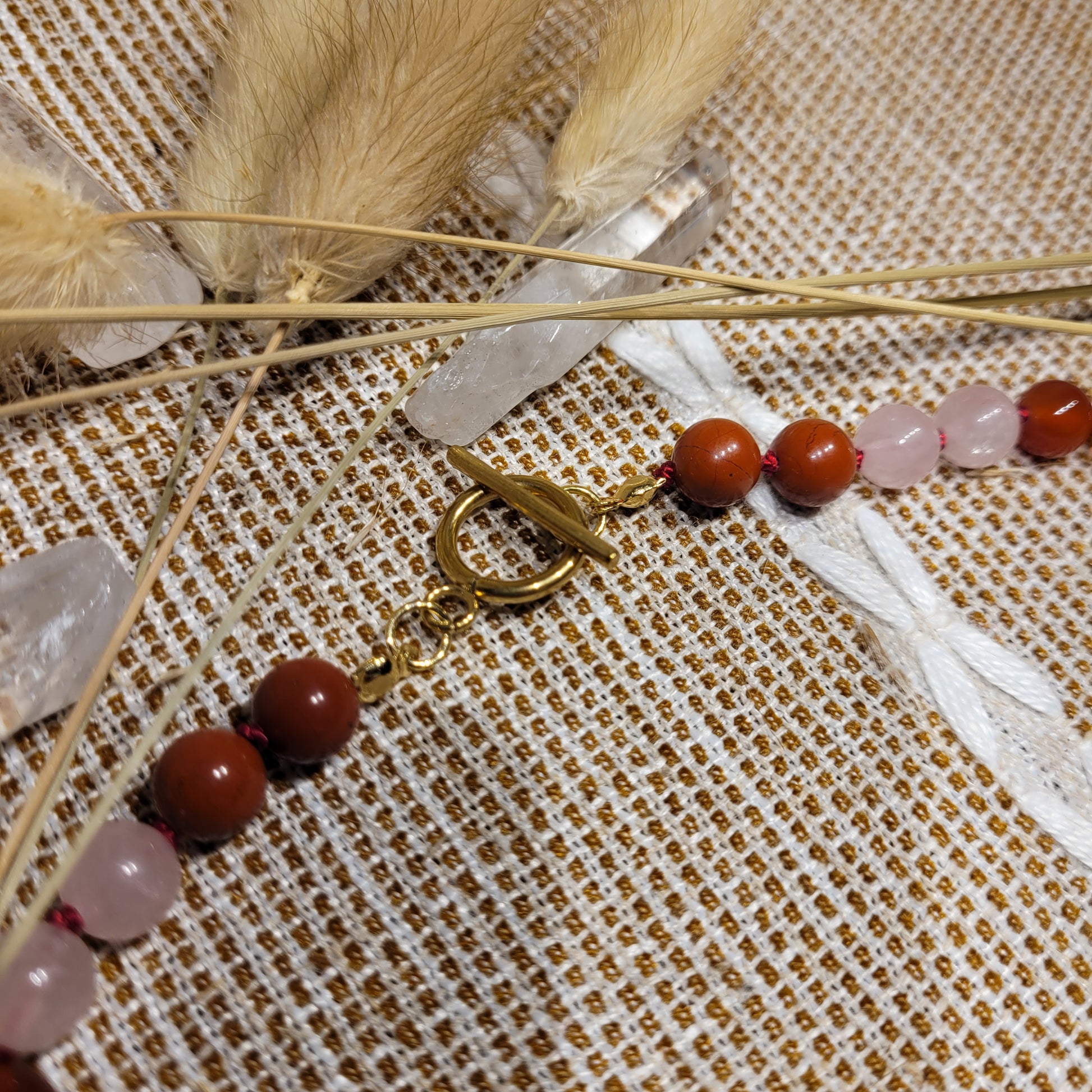 I created this stunning Love Necklace with gold stainless steel heart statement locket, gold stainless steel toggle clasp, between each bead is hand knotted with loving intent, and beautiful array of Rose Quartz, Red Jasper, and Carnelian crystals! Stunning choker/collar bone length!