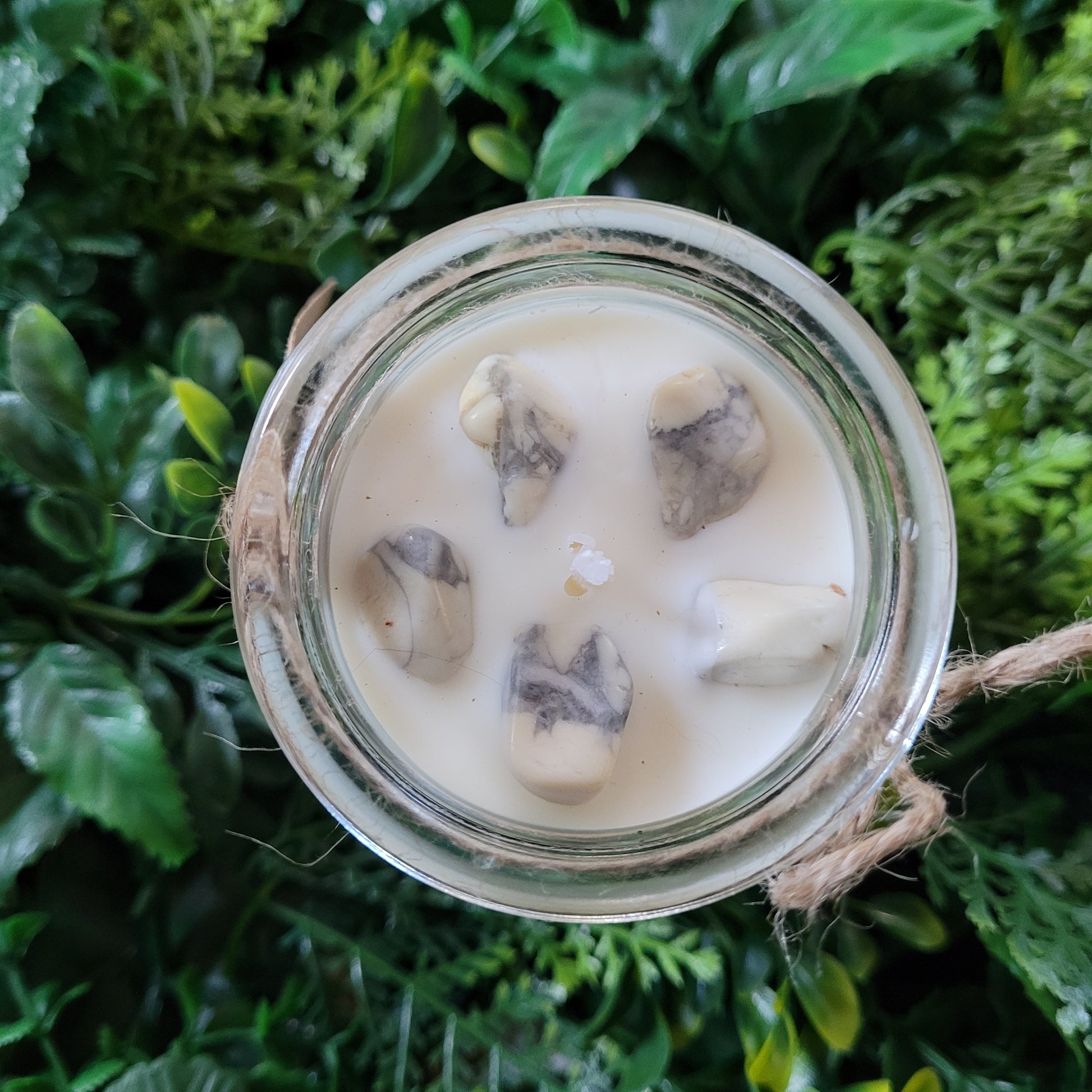 This candle has a lovely White Birch scent and is decorated with Howlite crystal chips on top!