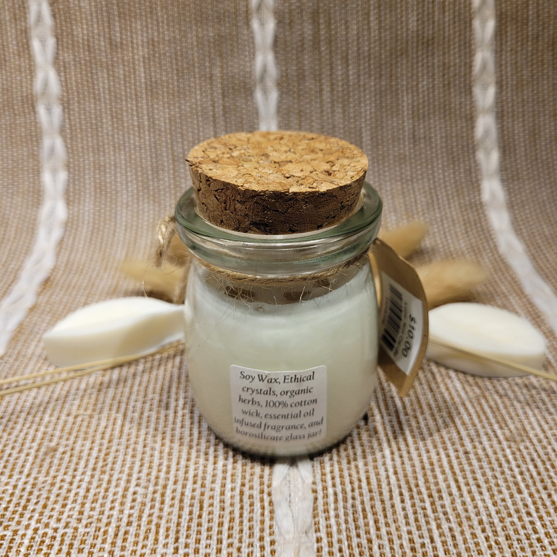 Handmade soy candles created with high-quality clean burning essential oil infused fragrance, 100% cotton wick, lead free borosilicate glass jar, decorated with organic dried herbs and ethically sourced crystals in a 3.4 oz Jar. Plus there is a hidden crystal on the bottom!