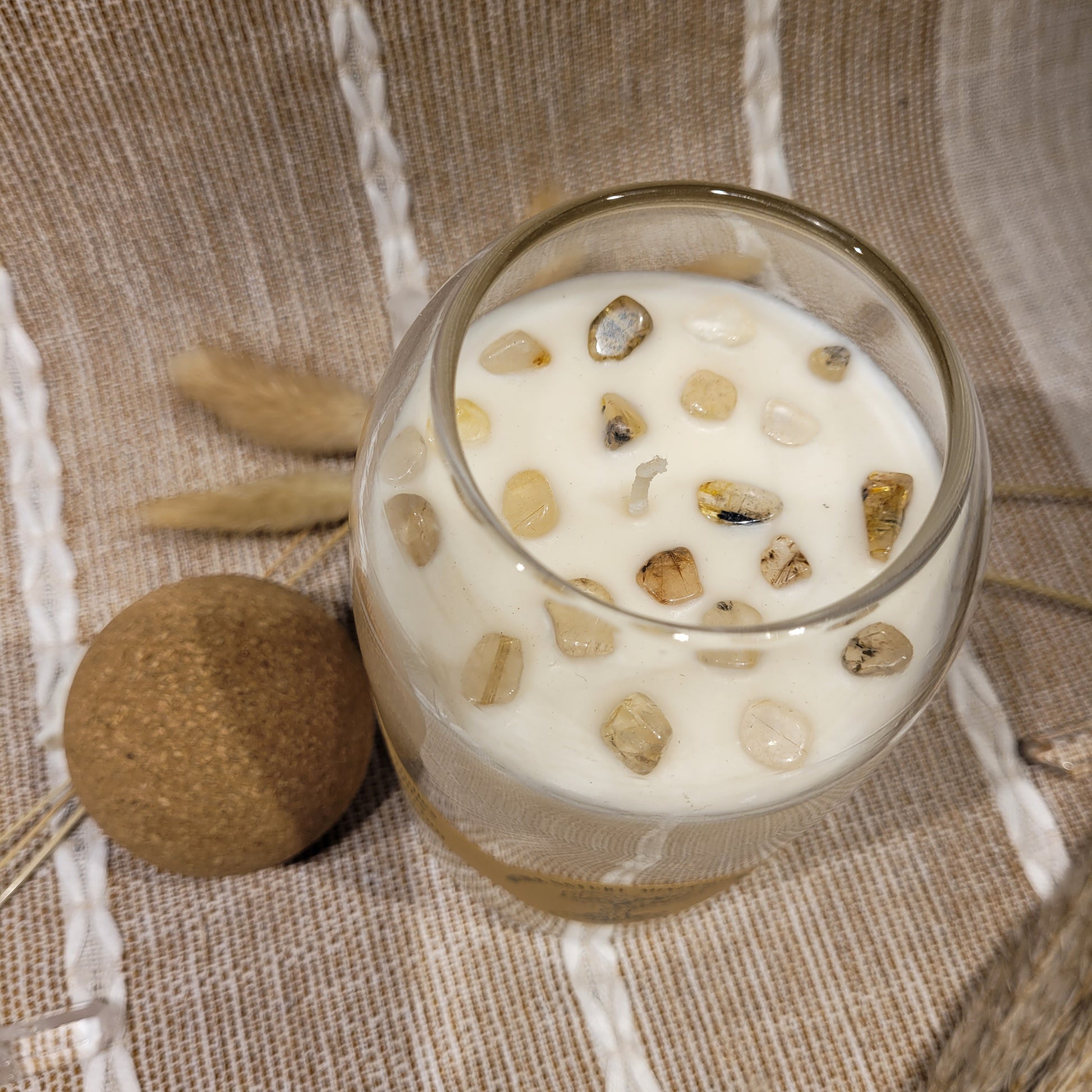 This candle has a lovely Amber Noir scent with Rutilated Quartz crystal chips on top!