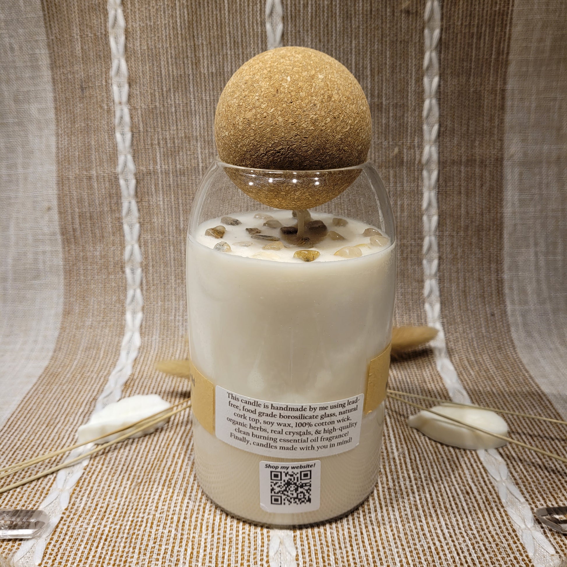 Handmade soy candles created with high-quality clean burning essential oil infused fragrance, 100% cotton wick, lead free borosilicate glass jar, decorated with organic dried herbs and ethically sourced crystals in a 25 oz Jar. Plus there is a hidden crystal on the bottom!