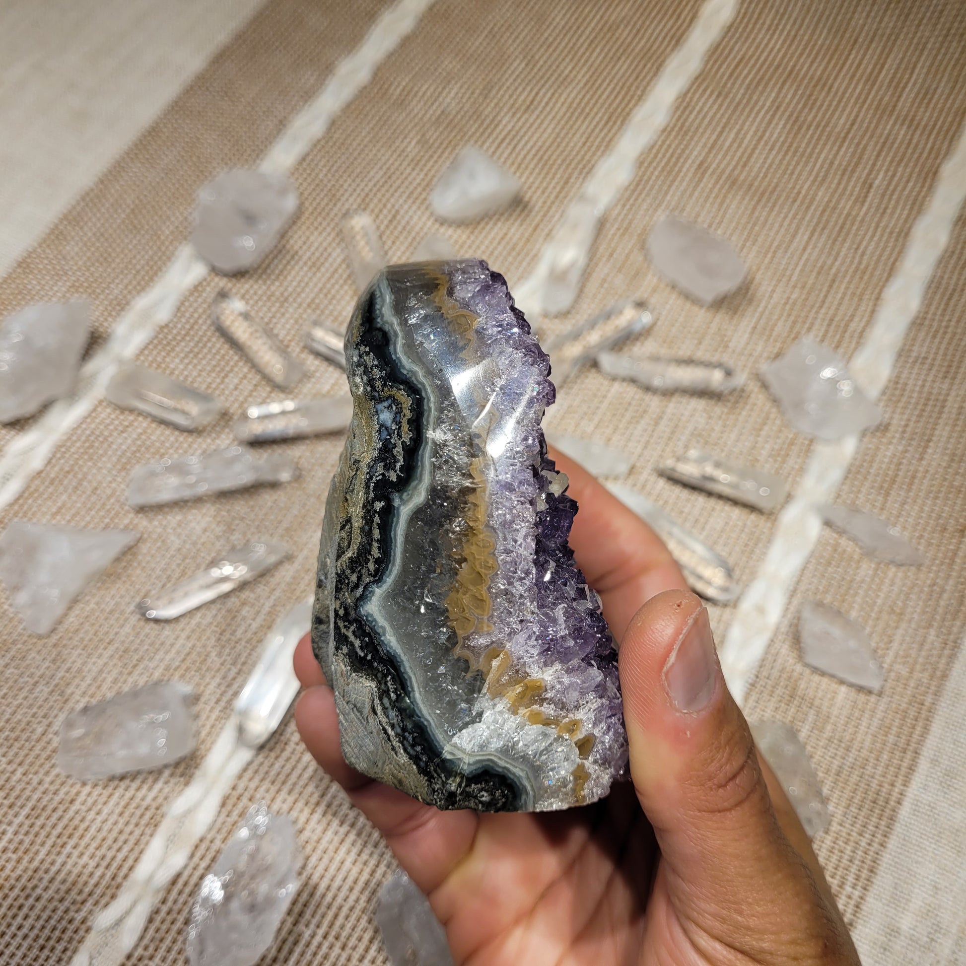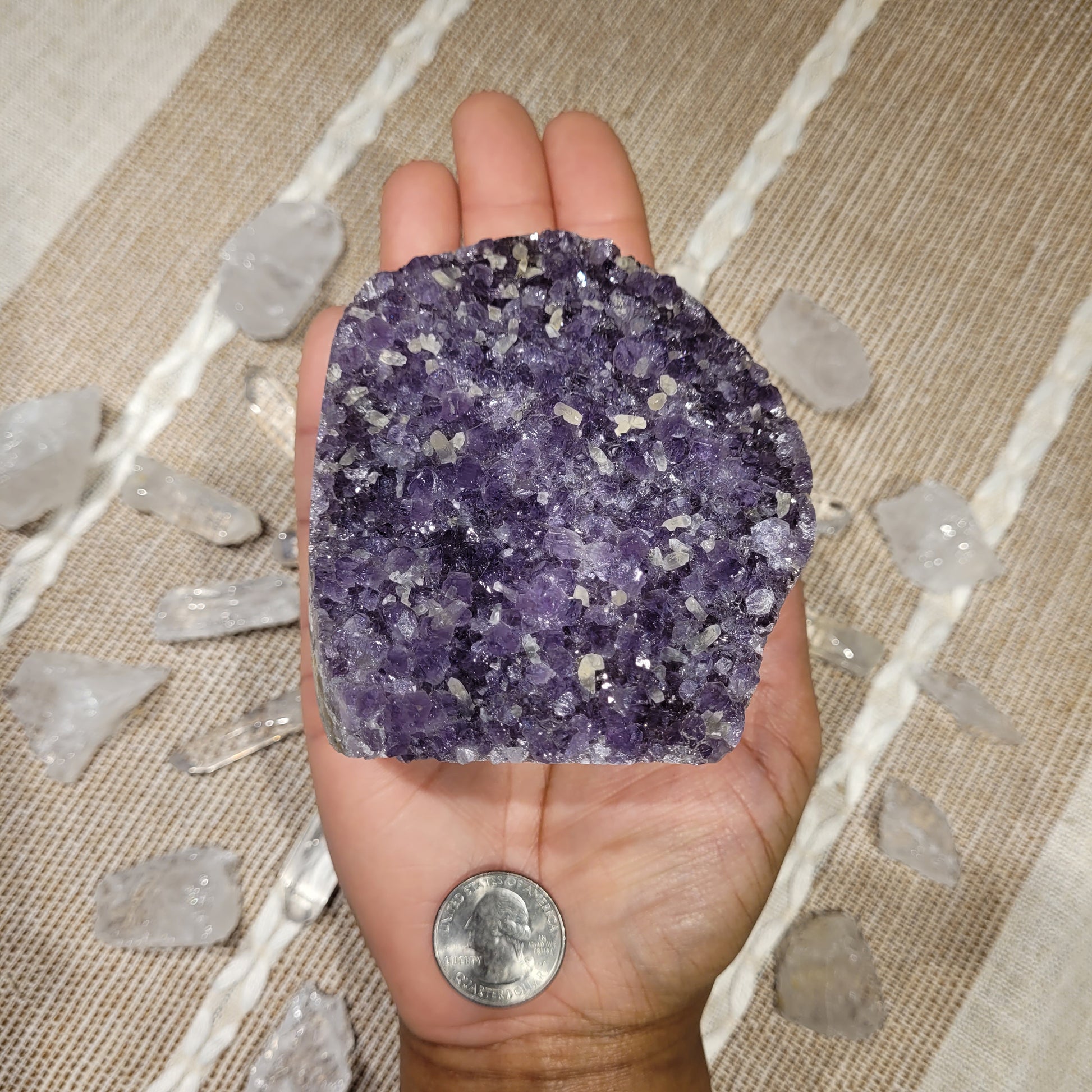 Amethyst Cut Base self standing with beautiful deep purple hue, calcite gems, and glittery look! Weighs approximately 455g.