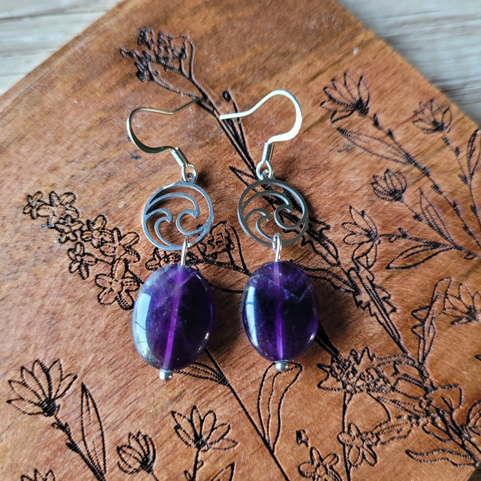 I created these beautiful earrings with stainless steel wave beach charms, stainless steel hooks, and ethically sourced Amethyst crystals from Brazil!