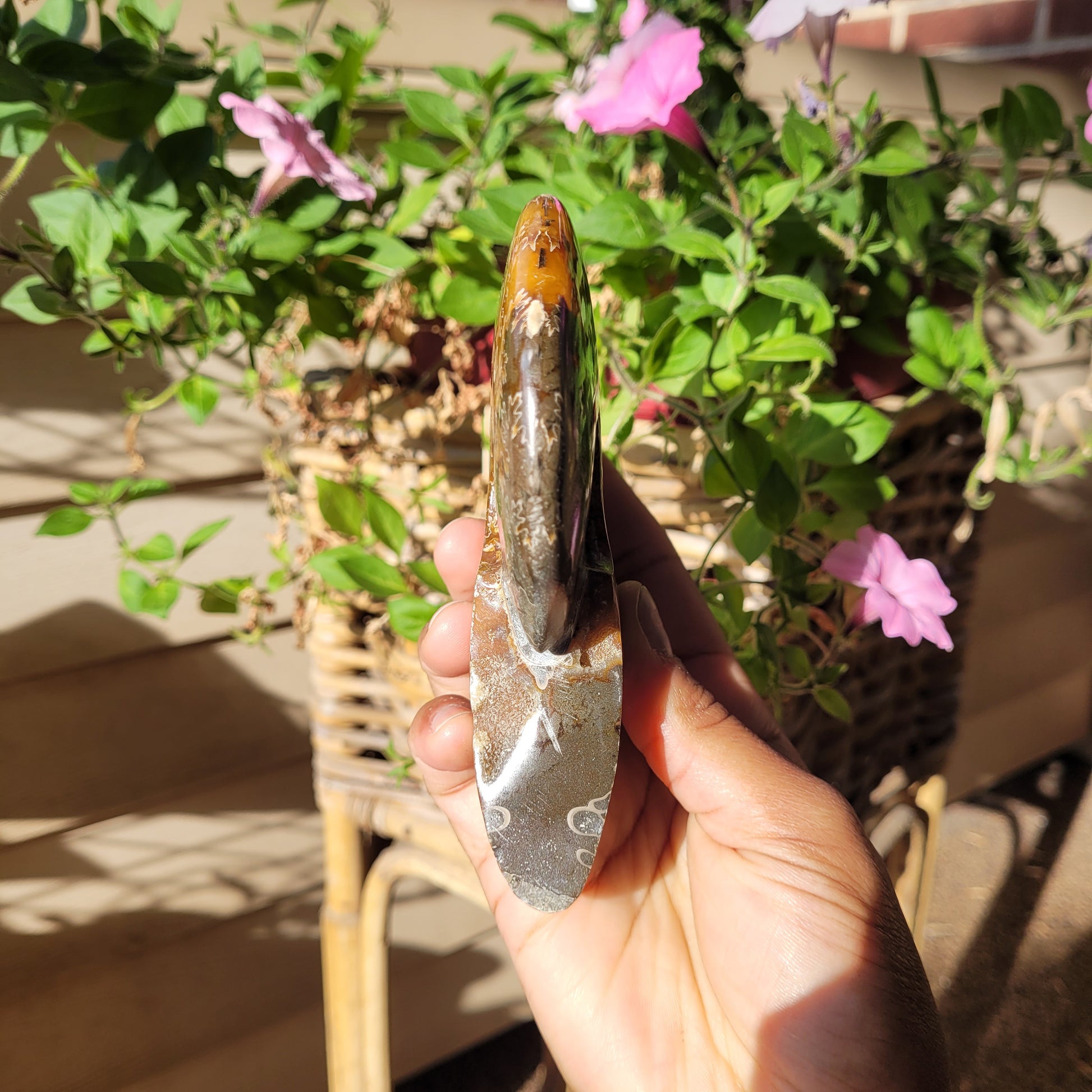 📖Crystal Properties:📖 Ammonites are an extinct group of mollusk animals that are closely related to octopuses and squid. The earliest traces of Ammonite date back to 420 million years ago, while the last known traces fall to 60 million years ago. Its name is derived from the Egyptian god Ammon, who was depicted wearing a ram's horn. Pliny the Elder first recorded these fossils in 79 A.D. near Pompeii and originally named them Ammonis Cornua after their horn-like shape. The creatures that lived in these shells swam in open waters, filling chambers of the shell with gas to maintain buoyancy. Ammonites are found all over the world, however, a large majority of the commercial supply comes out of Morocco.
