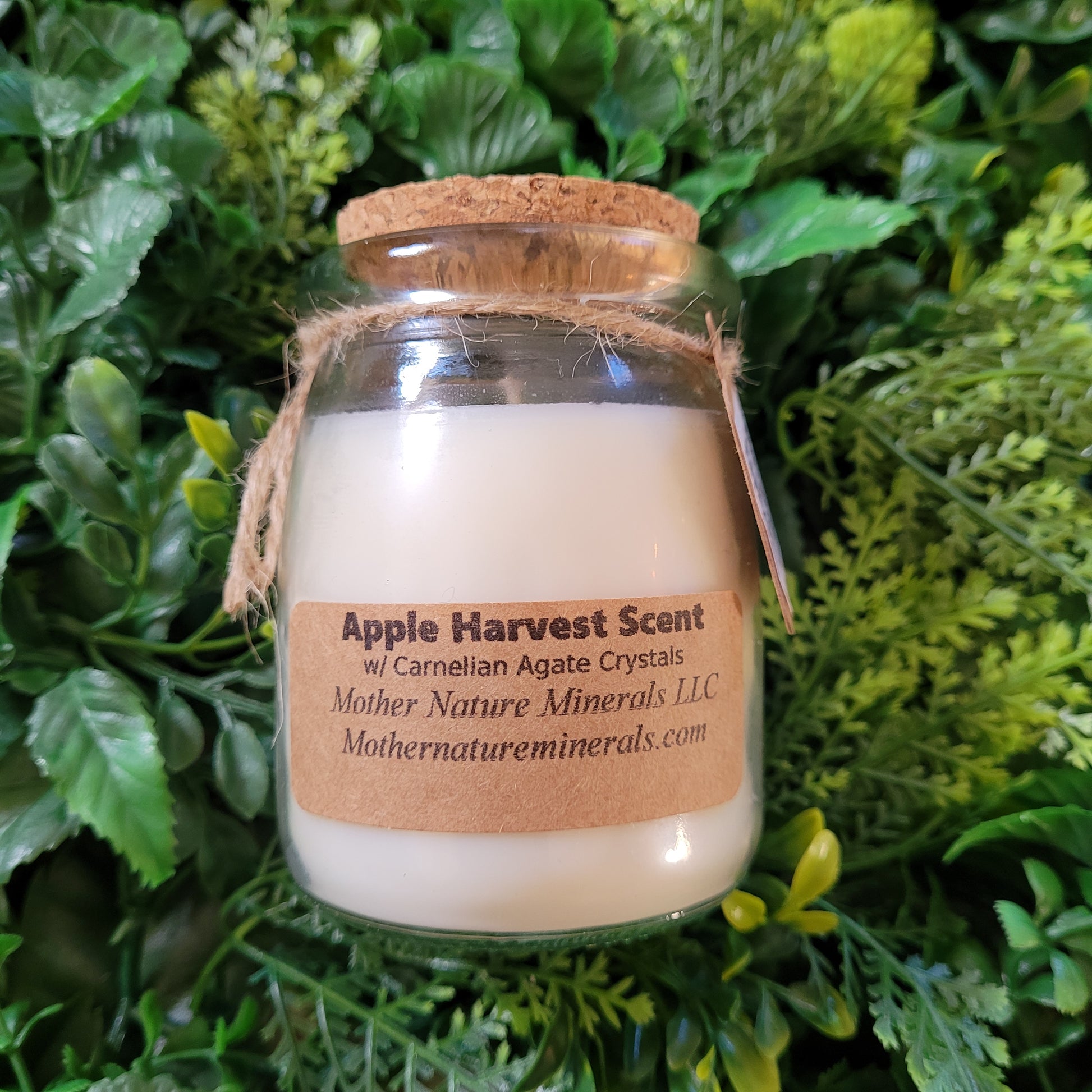 This candle has a lovely Apple Harvest scent with Carnelian Crystal chips on top!