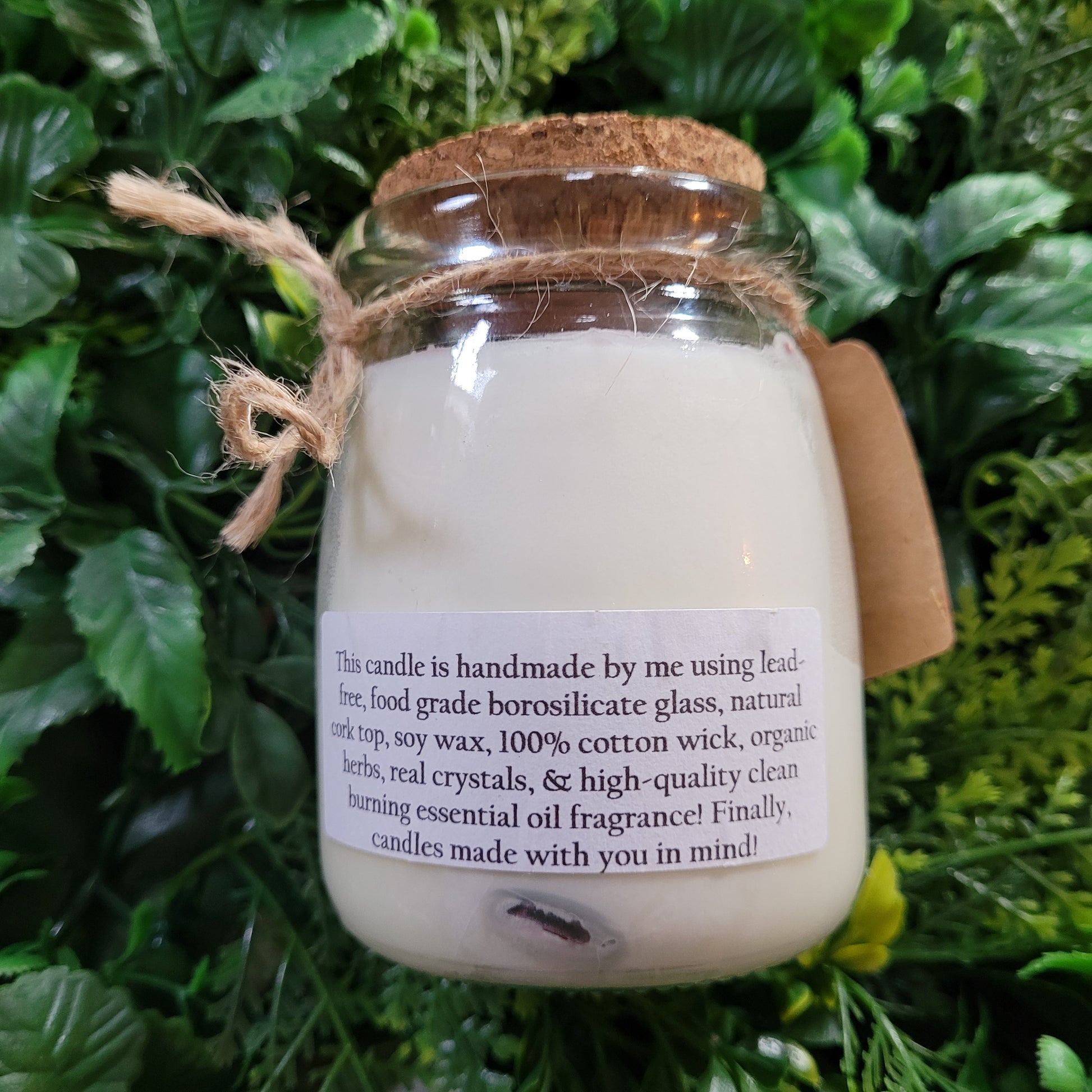 Handmade soy candles created with high quality, clean burning fragrance oil, decorated with organic dried herbs and natural ethically sourced crystals in a 7 oz. Jar. Plus there is a hidden crystal on the bottom!
