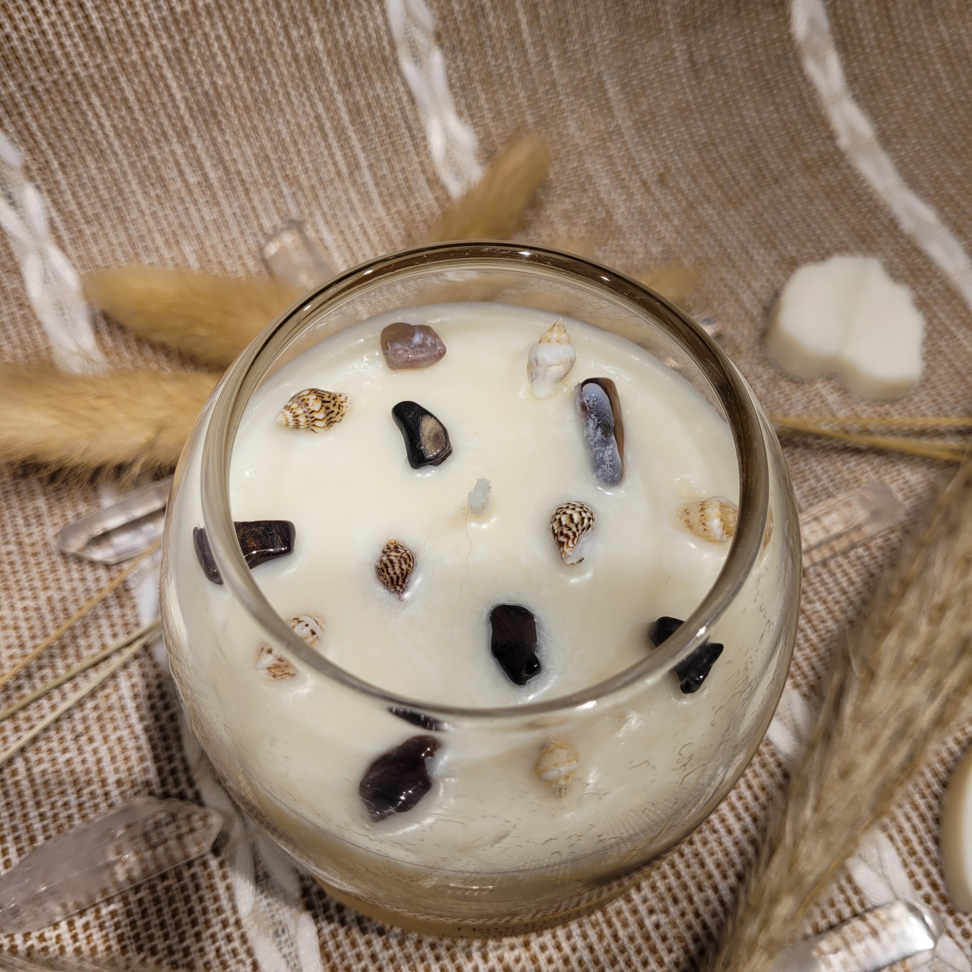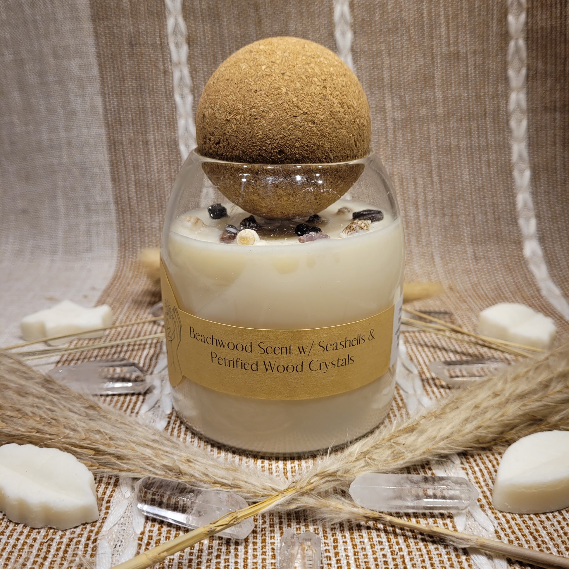 This candle has a lovely Beachwood scent and decorated with sea shells and Petrified Wood Crystal chips on top!
