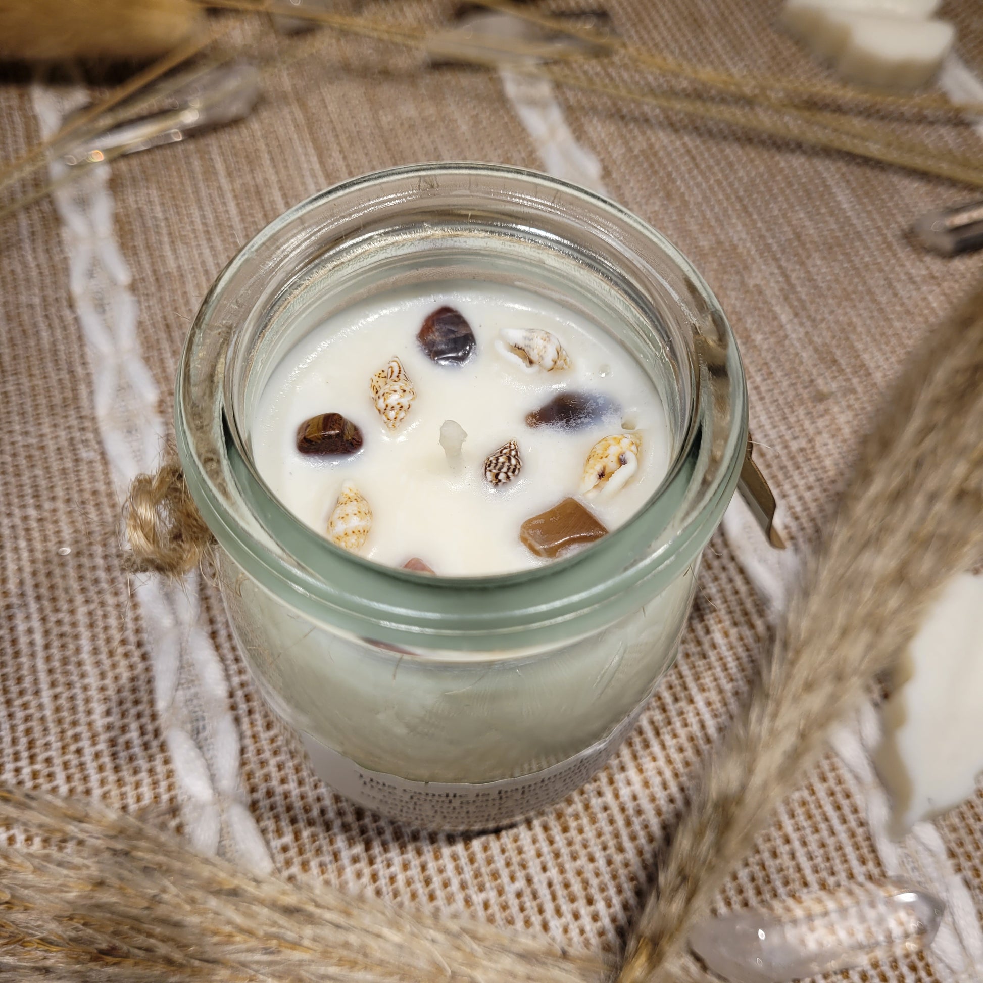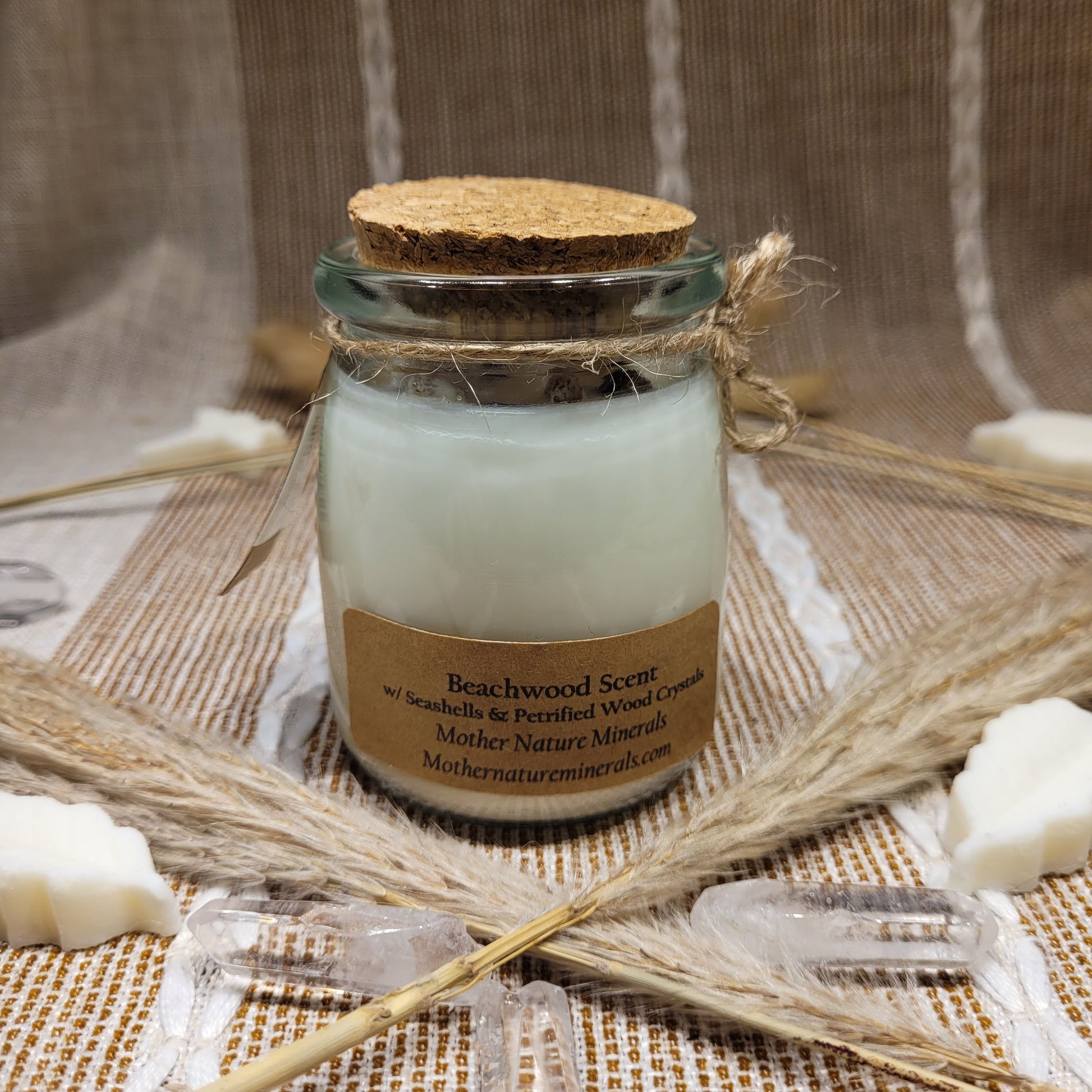 This candle has a lovely Beachwood scent and decorated with sea shells and Petrified Wood Crystal chips on top!