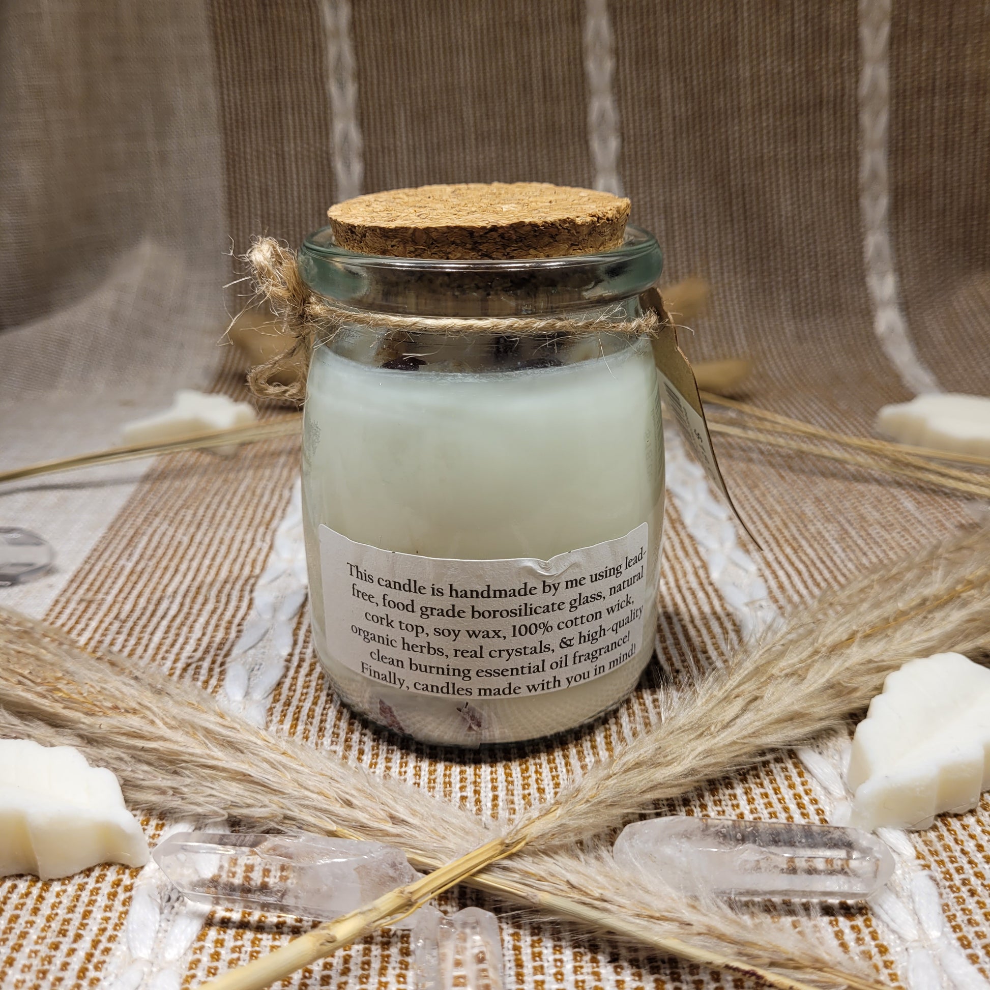 Handmade soy candles created with high-quality clean burning essential oil infused fragrance, 100% cotton wick, lead free borosilicate glass jar, decorated with organic dried herbs and ethically sourced crystals in a 7 oz Jar. Plus there is a hidden crystal on the bottom!