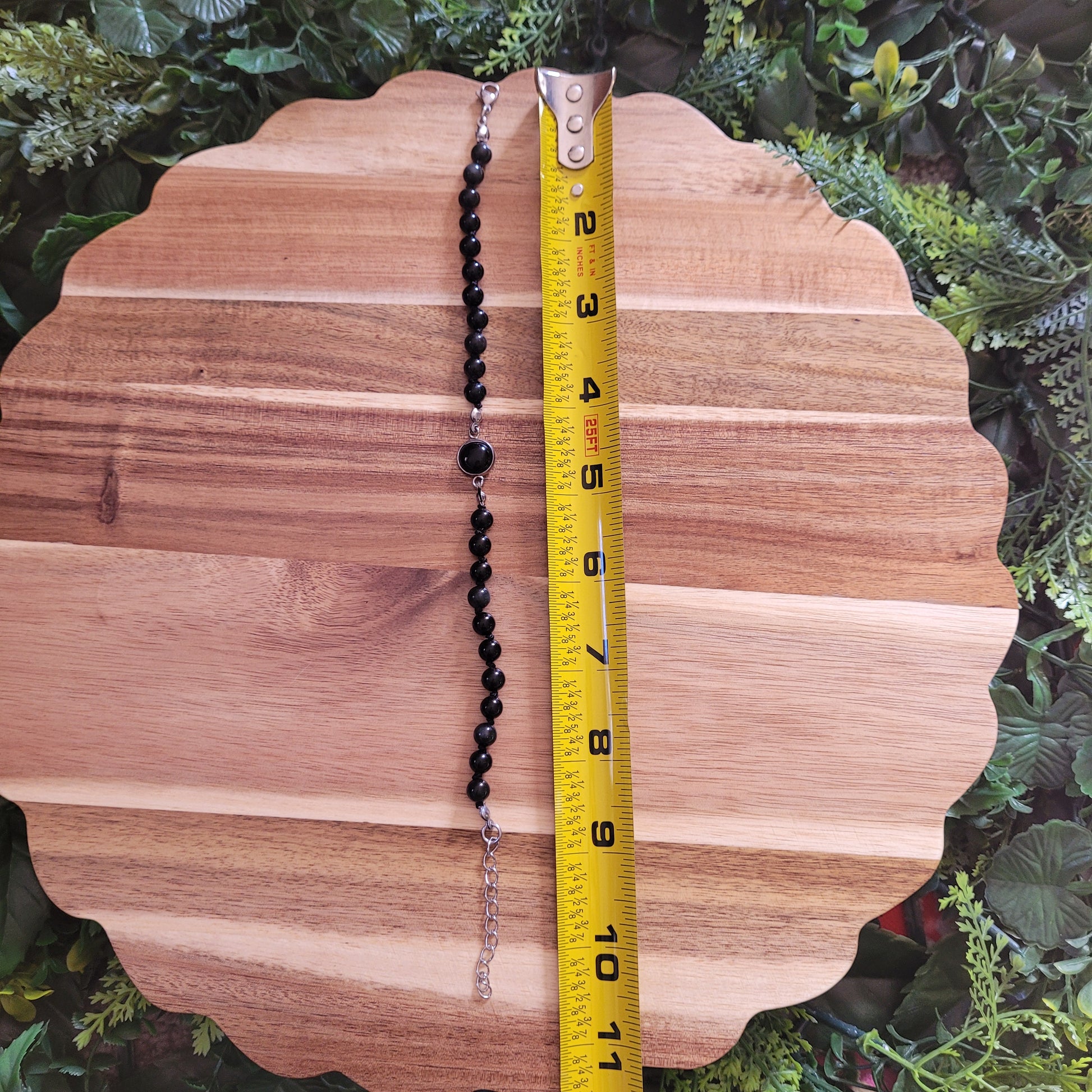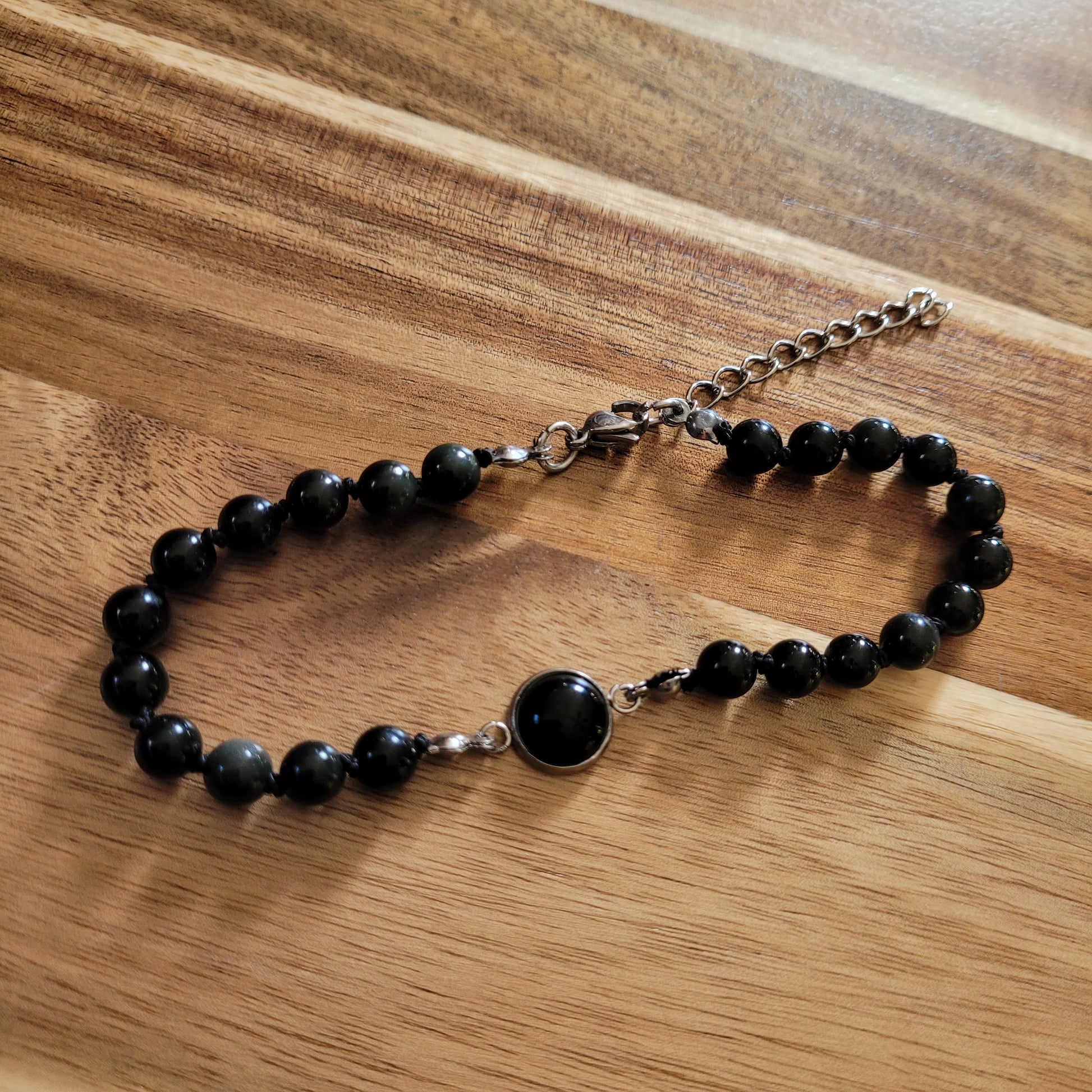 I created this anklet with obsidian (black and silver Sheen Obsidian) crystals, stainless steel pendant, handknotted with 100% natural silk, and stainless steel adjustable chain!