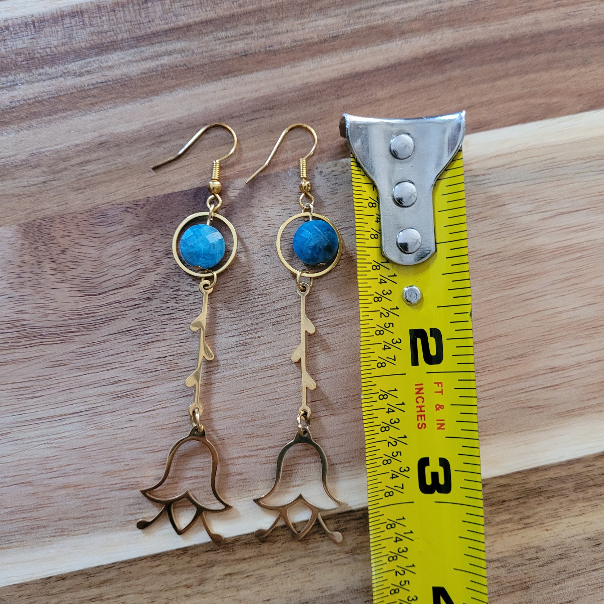 I created these Blue Apatite earrings with faceted Blue Apatite crystals, gold stainless steel floral charms, and with gold stainless steel hooks!