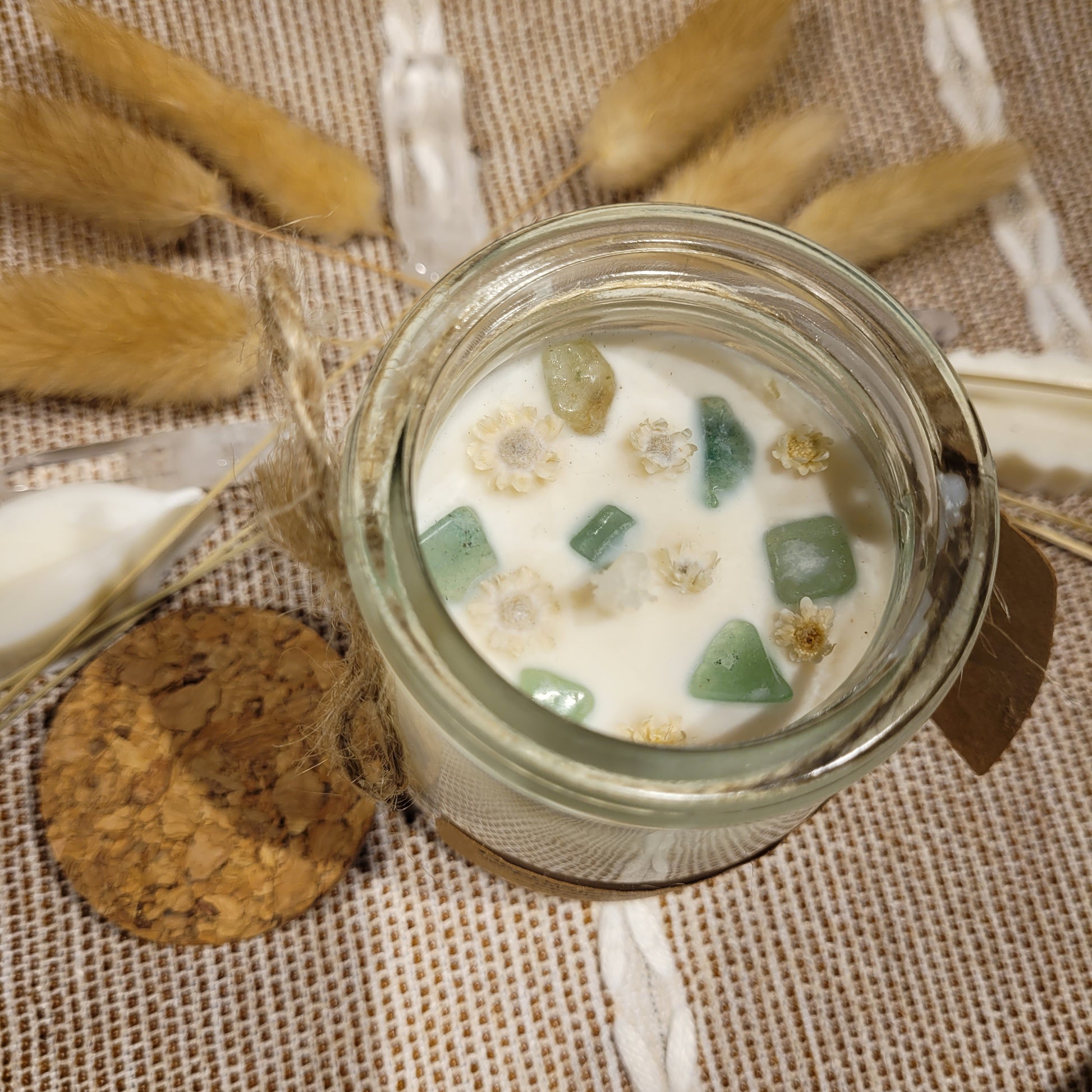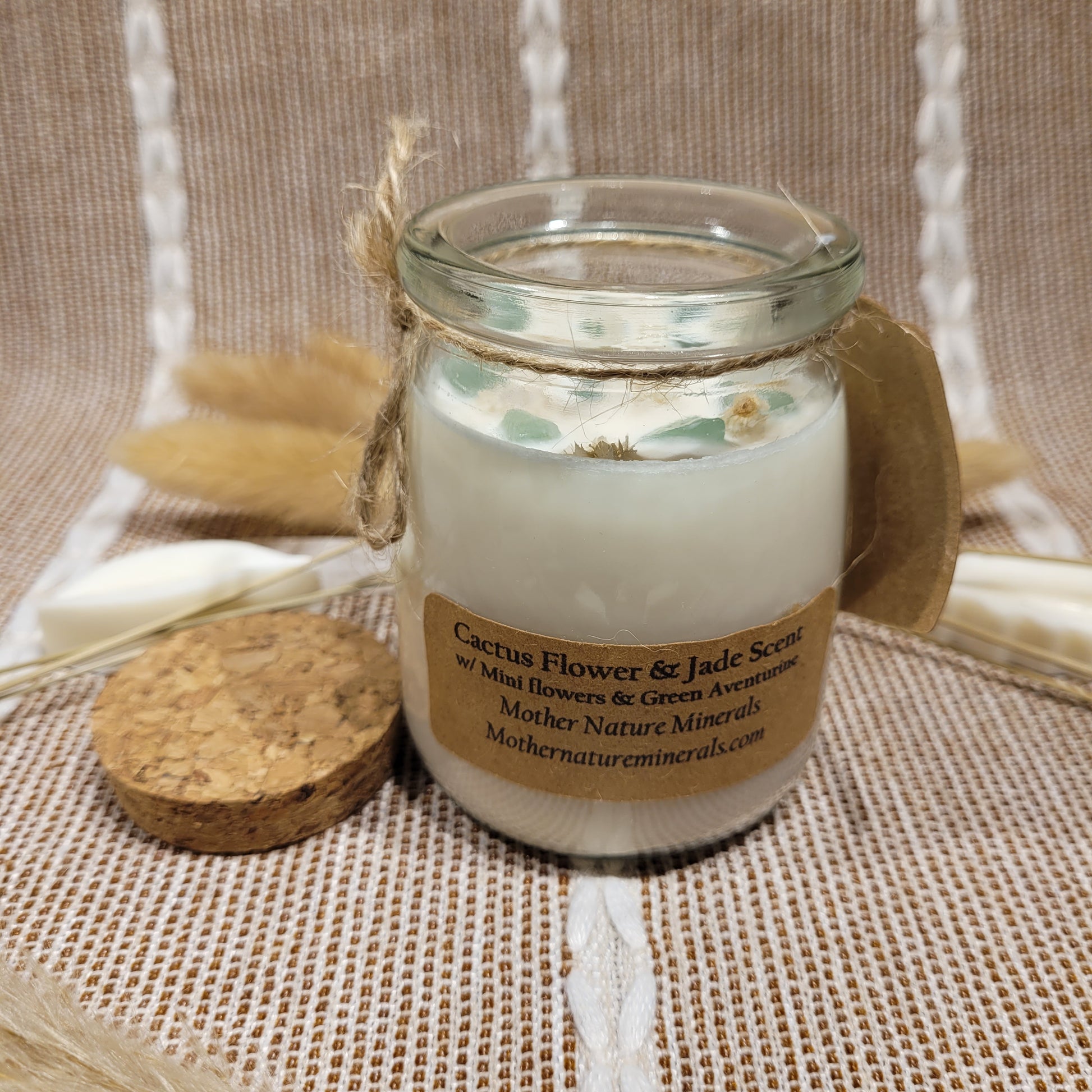 Cactus Flower and Jade scented candle decorated with mini flowers and Green Aventurine Crystal Chips on top!