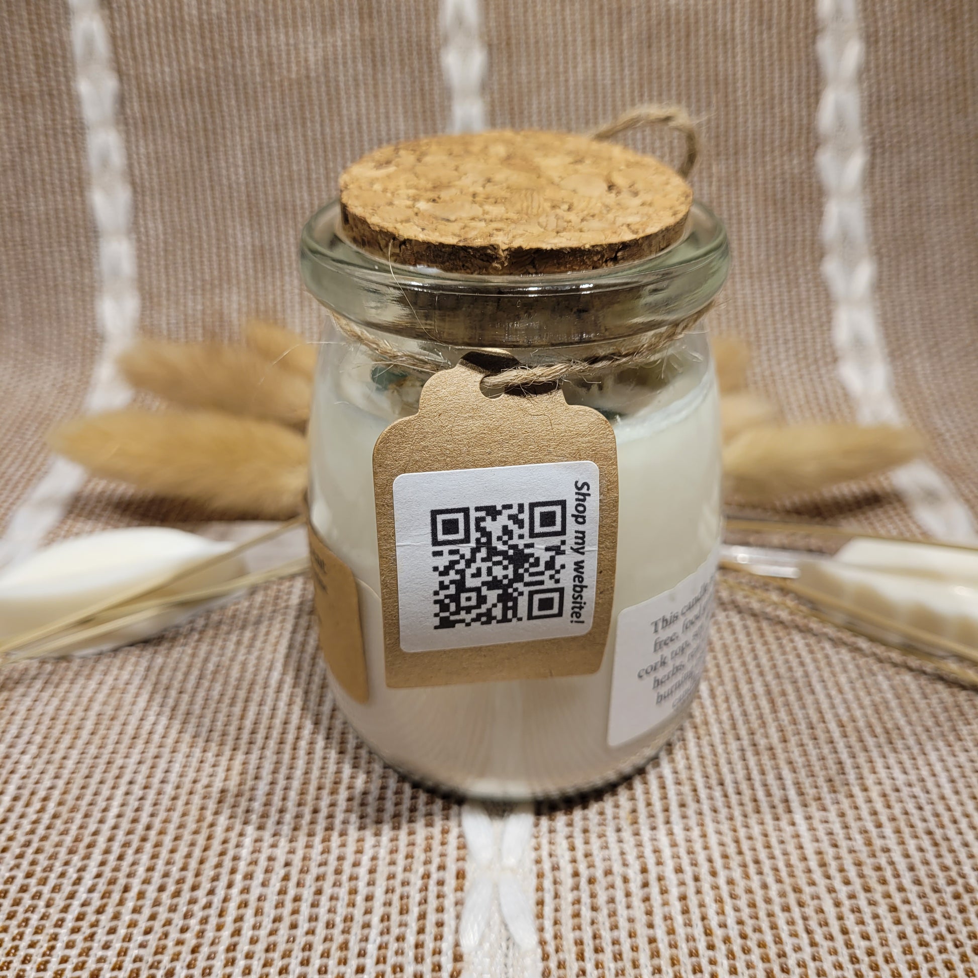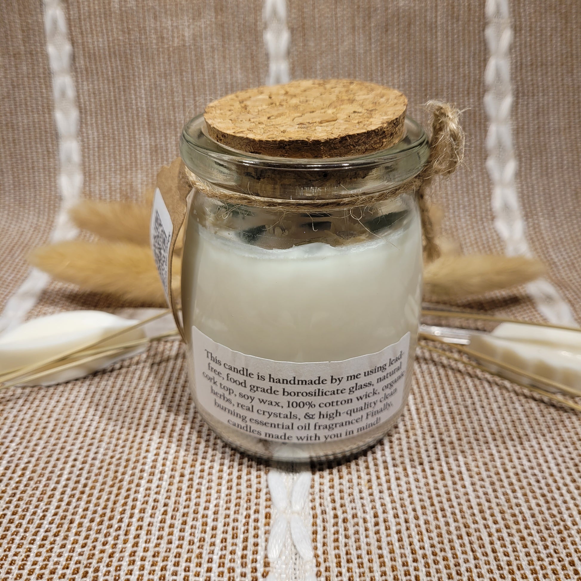 Handmade soy candles created with high-quality clean burning essential oil infused fragrance, 100% cotton wick, lead free borosilicate glass jar, decorated with organic dried herbs and ethically sourced crystals in a 7 oz Jar. Plus there is a hidden crystal on the bottom!