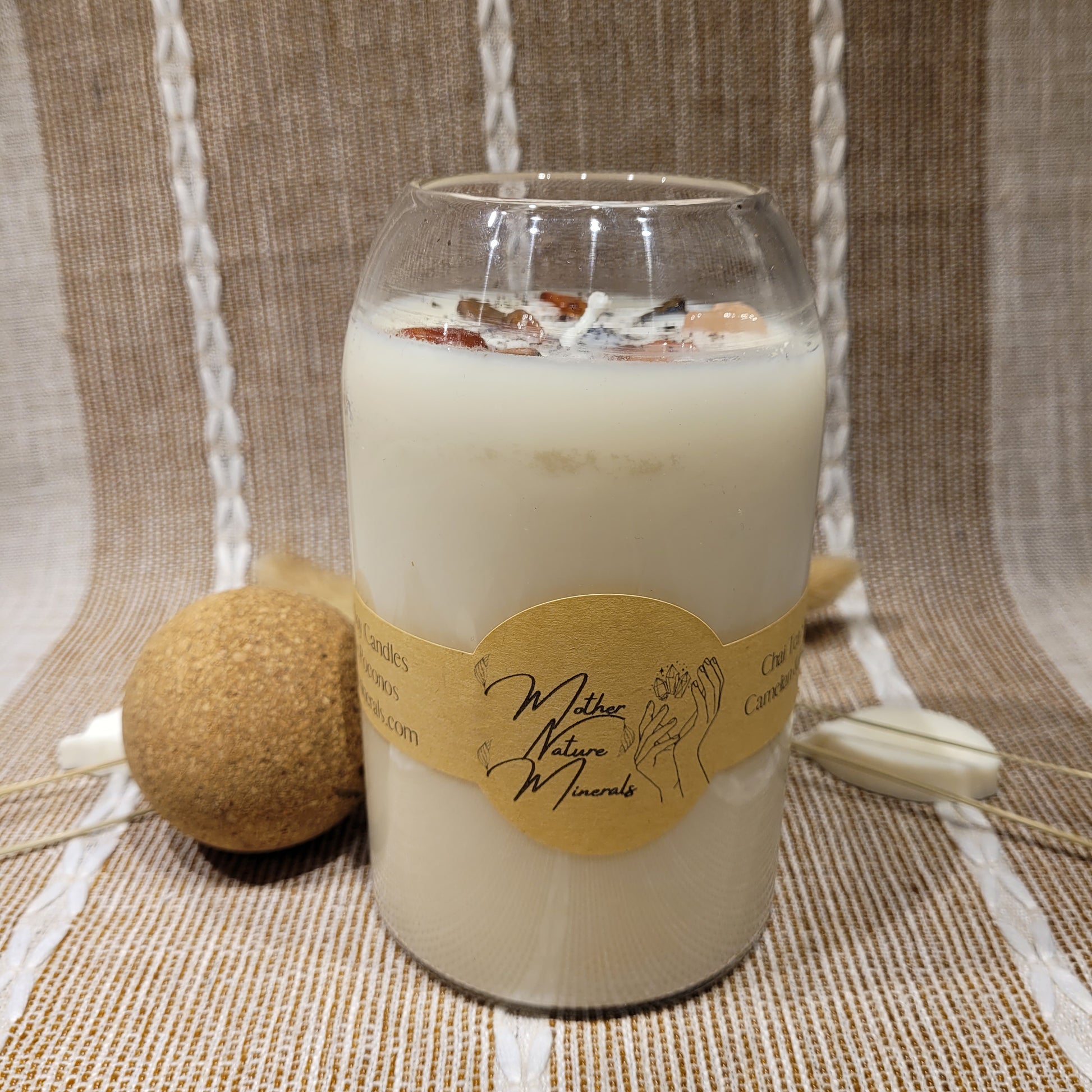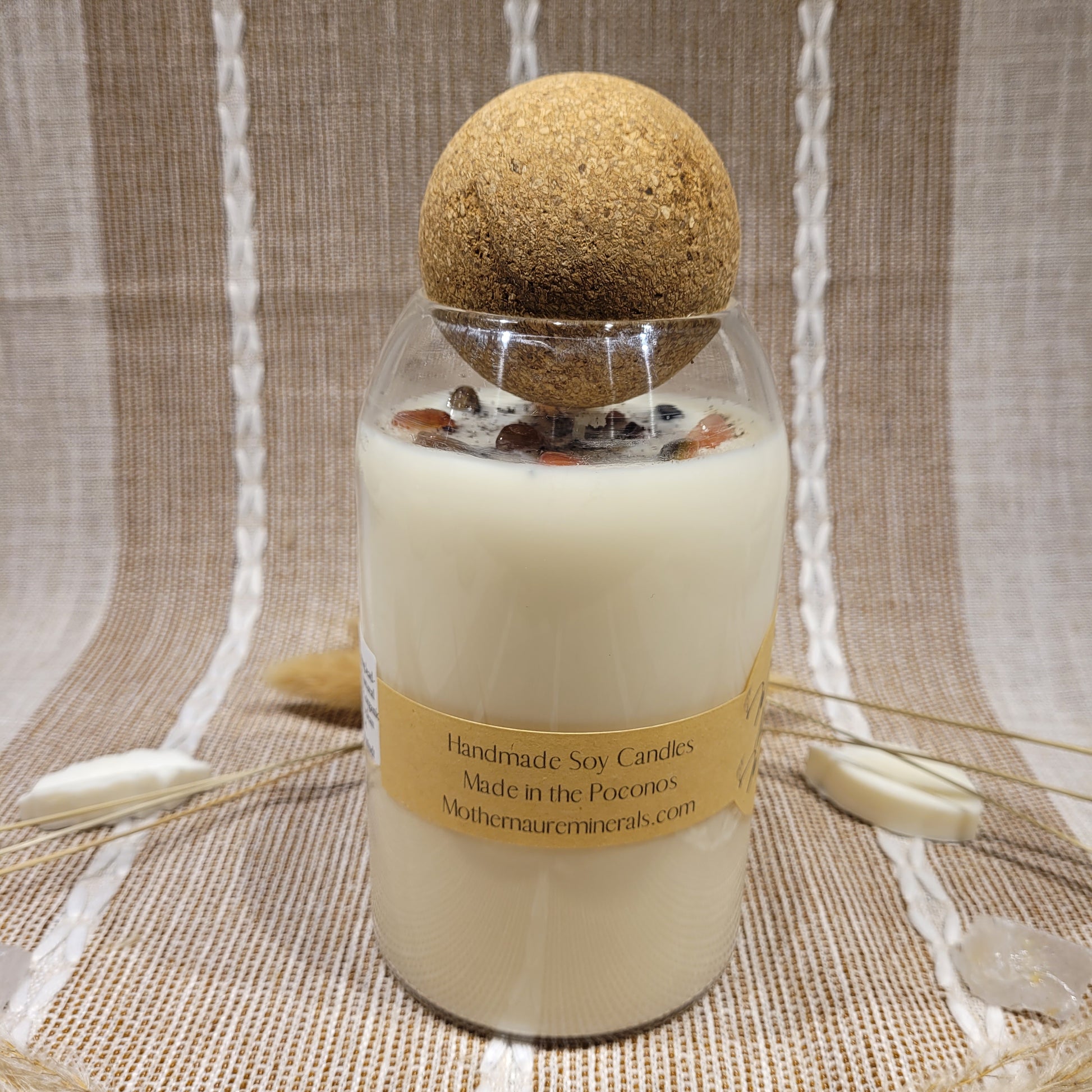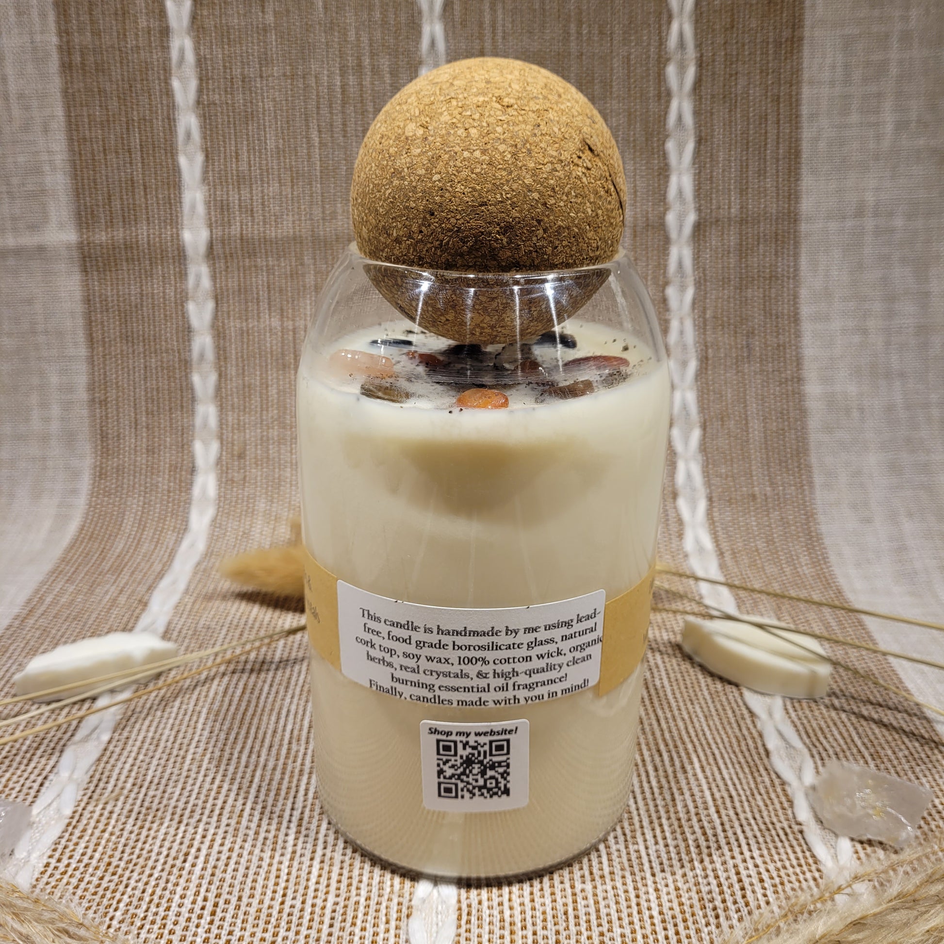 Handmade soy candles created with high-quality clean burning essential oil infused fragrance, 100% cotton wick, lead free borosilicate glass jar, decorated with organic dried herbs and ethically sourced crystals in a 25 oz Jar. Plus there is a hidden crystal on the bottom!