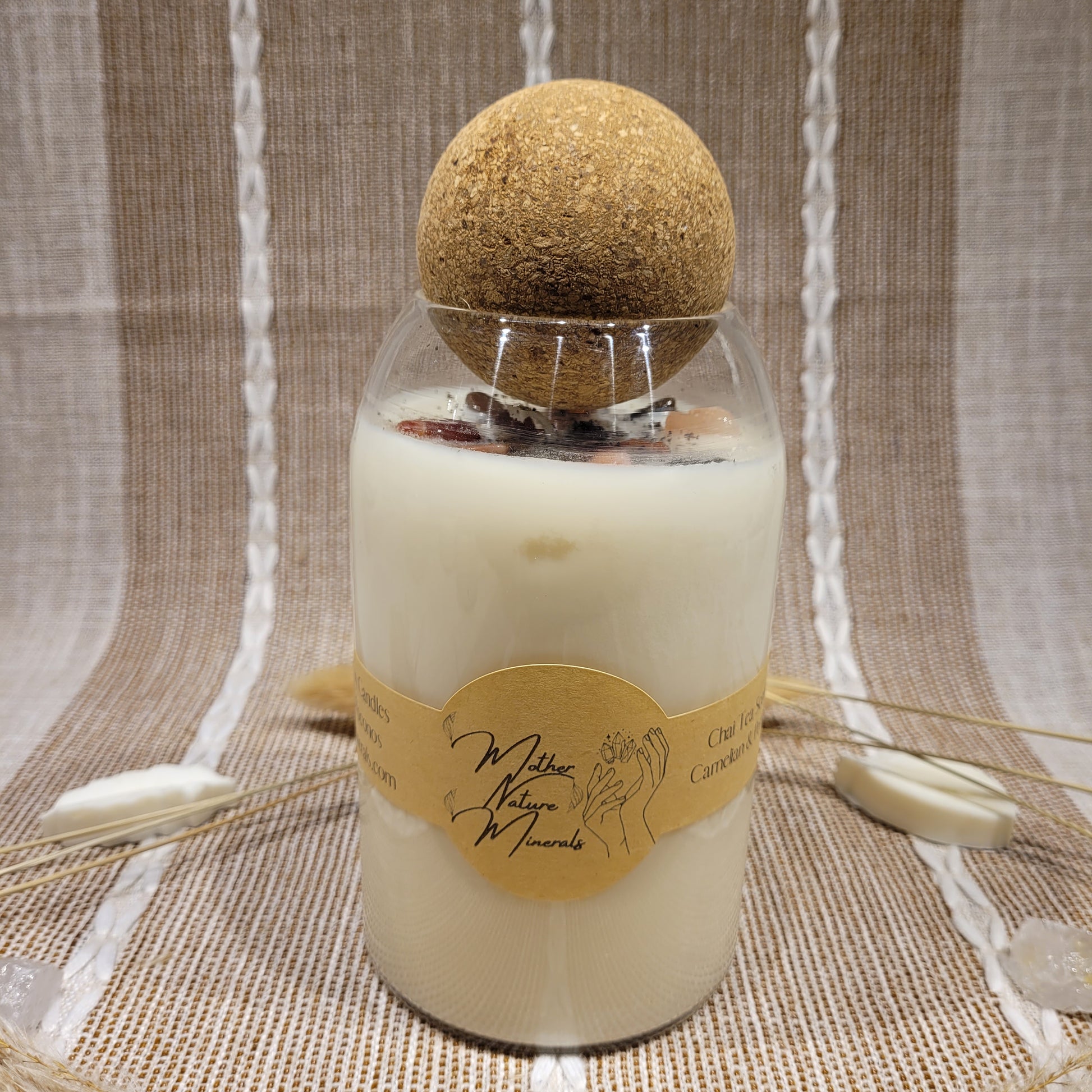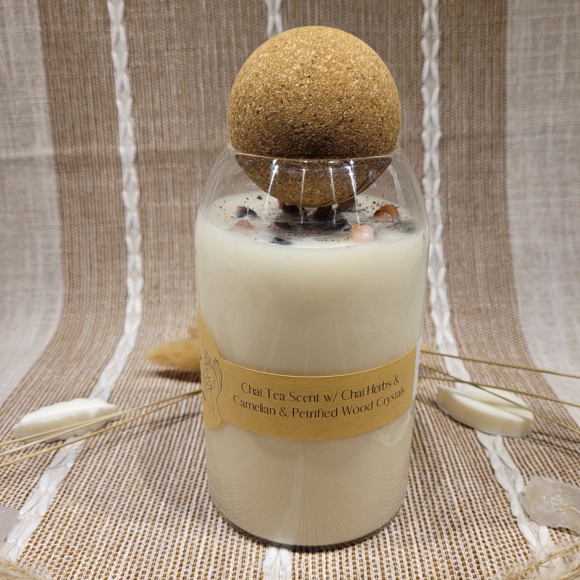 Chai Tea scented candle with decorated with Chai Leaves, Carnelian, and Petrified Wood Crystal chips on top!
