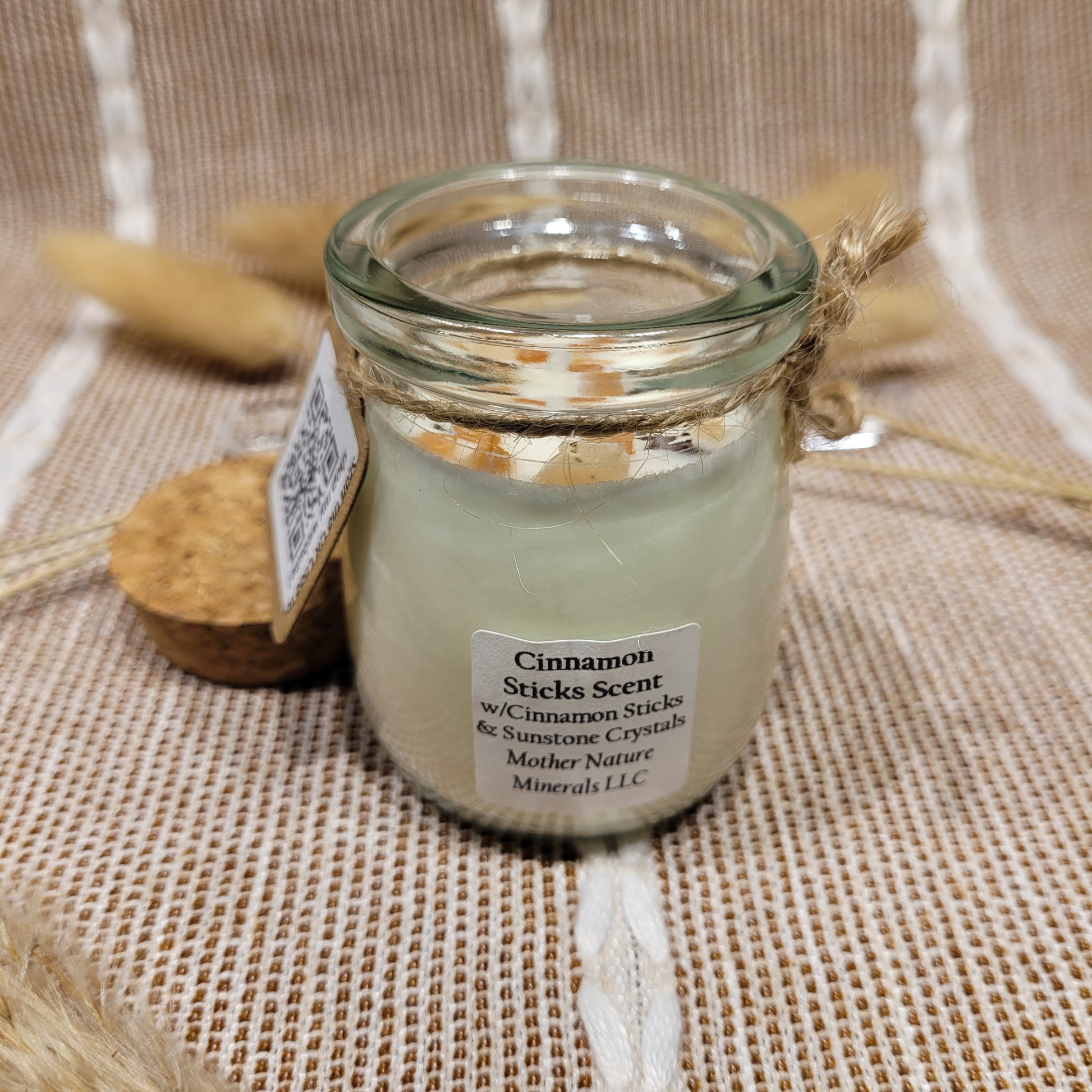 This candle has a lovely Cinnamon Stick scent with organic Cinnamon Sticks and Sunstone crystal chips on top!