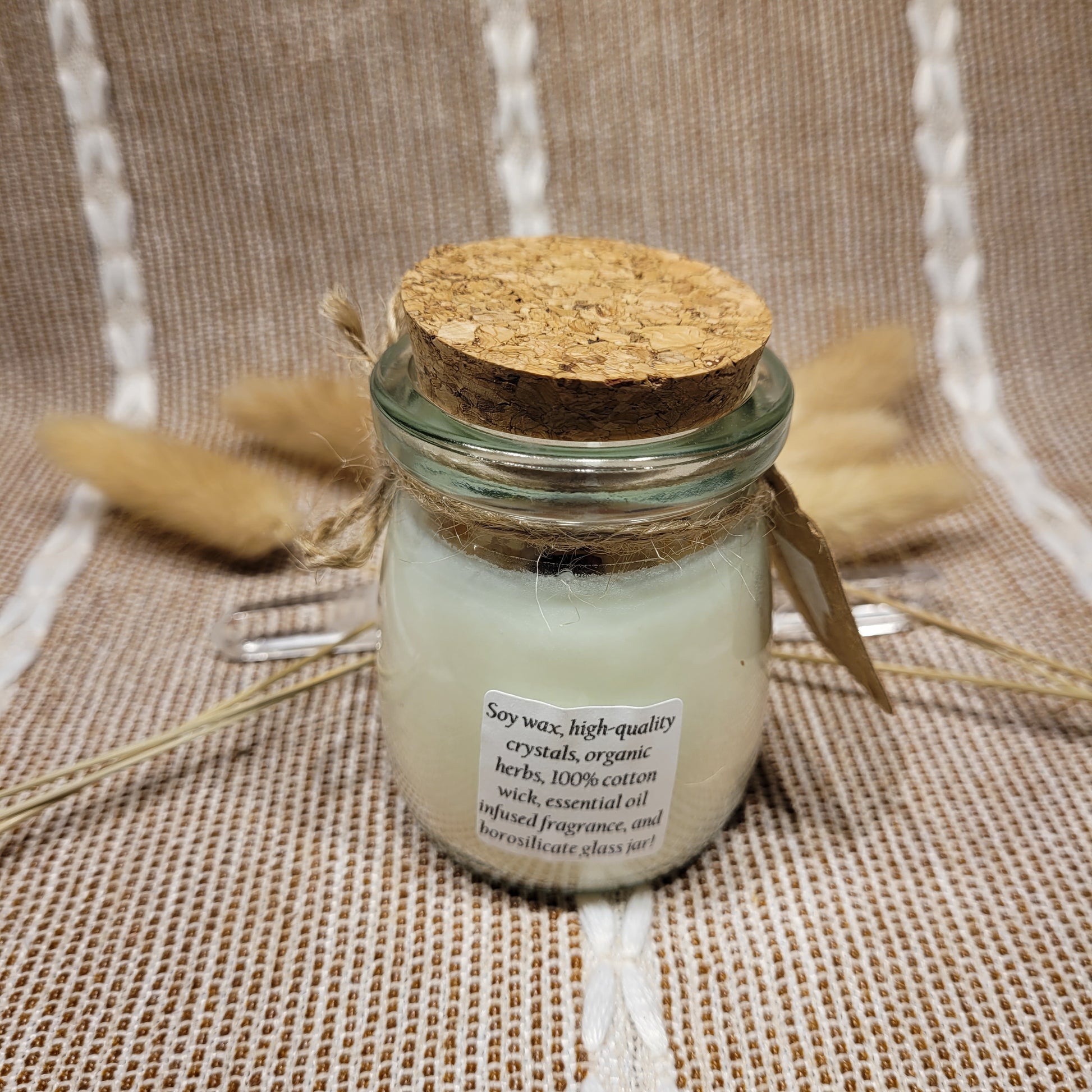 Handmade soy candles created with high-quality clean burning essential oil infused fragrance, 100% cotton wick, lead free borosilicate glass jar, decorated with organic dried herbs and ethically sourced crystals in a 3.4 oz Jar. Plus there is a hidden crystal on the bottom!