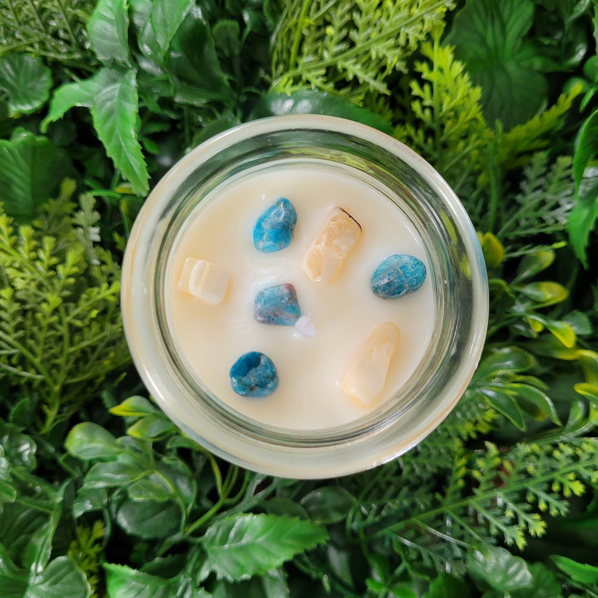 Day at the Spa scented candle with decorated with Mother of Pearl and Lapis Lazuli or Blue Apatite Crystal chips on top!