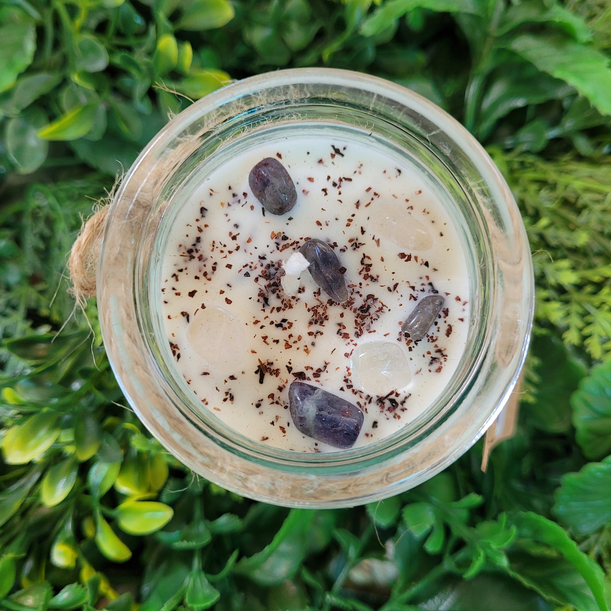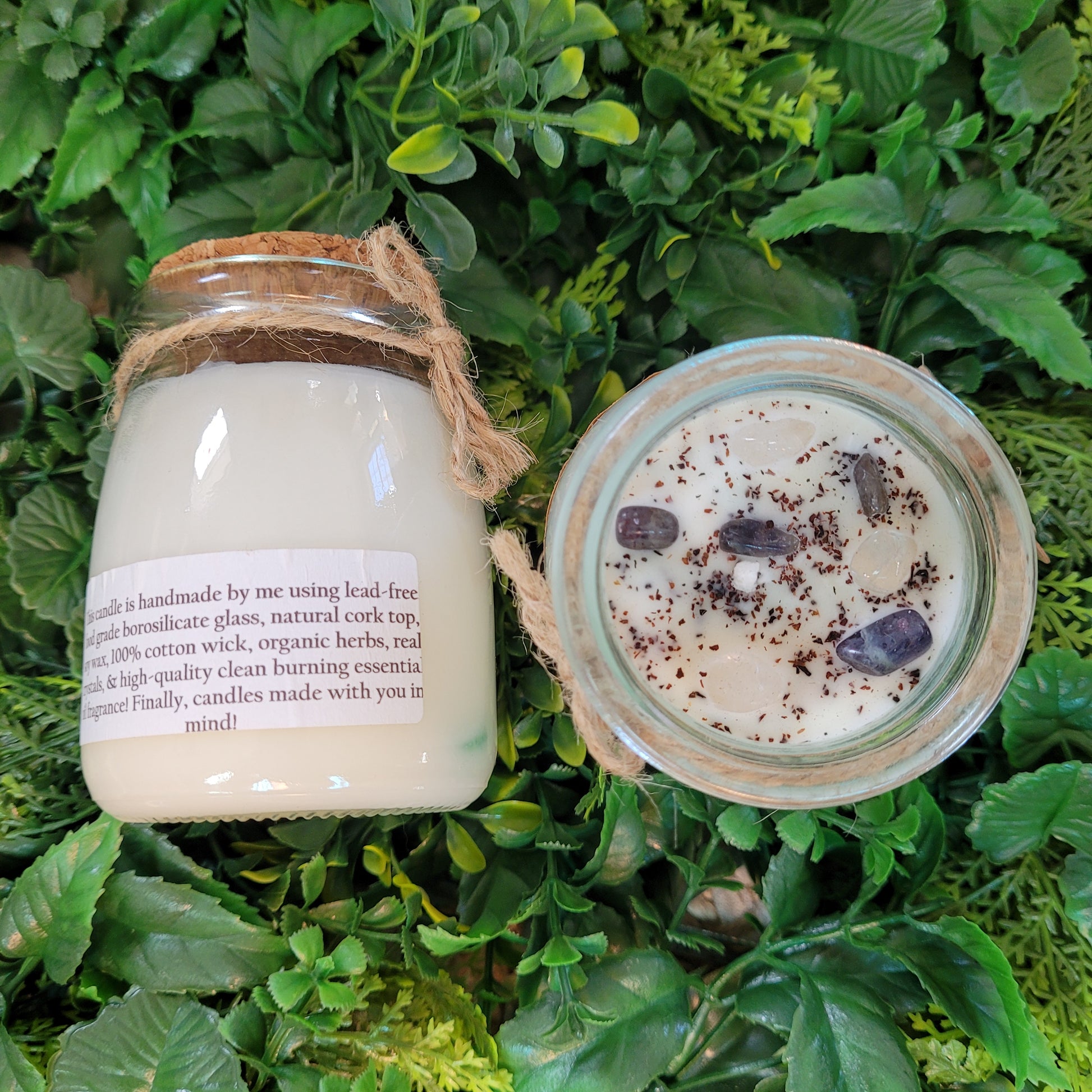 Handmade soy candles created with high-quality clean burning essential oil infused fragrance, 100% cotton wick, lead free borosilicate glass jar, decorated with organic dried herbs and ethically sourced crystals in a 7 oz Jar. Plus there is a hidden crystal on the bottom!