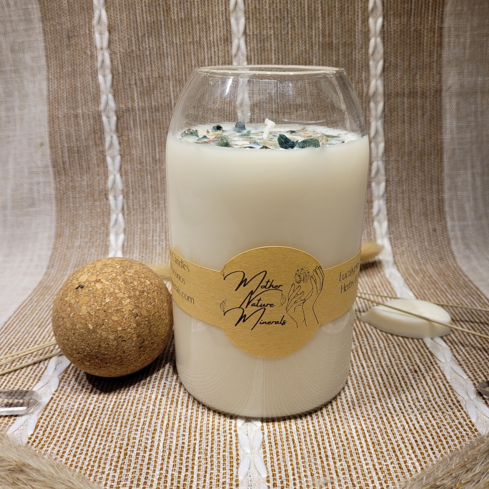 This candle has a lovely Eucalyptus scent and decorated with Eucalyptus herbs and Moss Agate crystal chips on top!