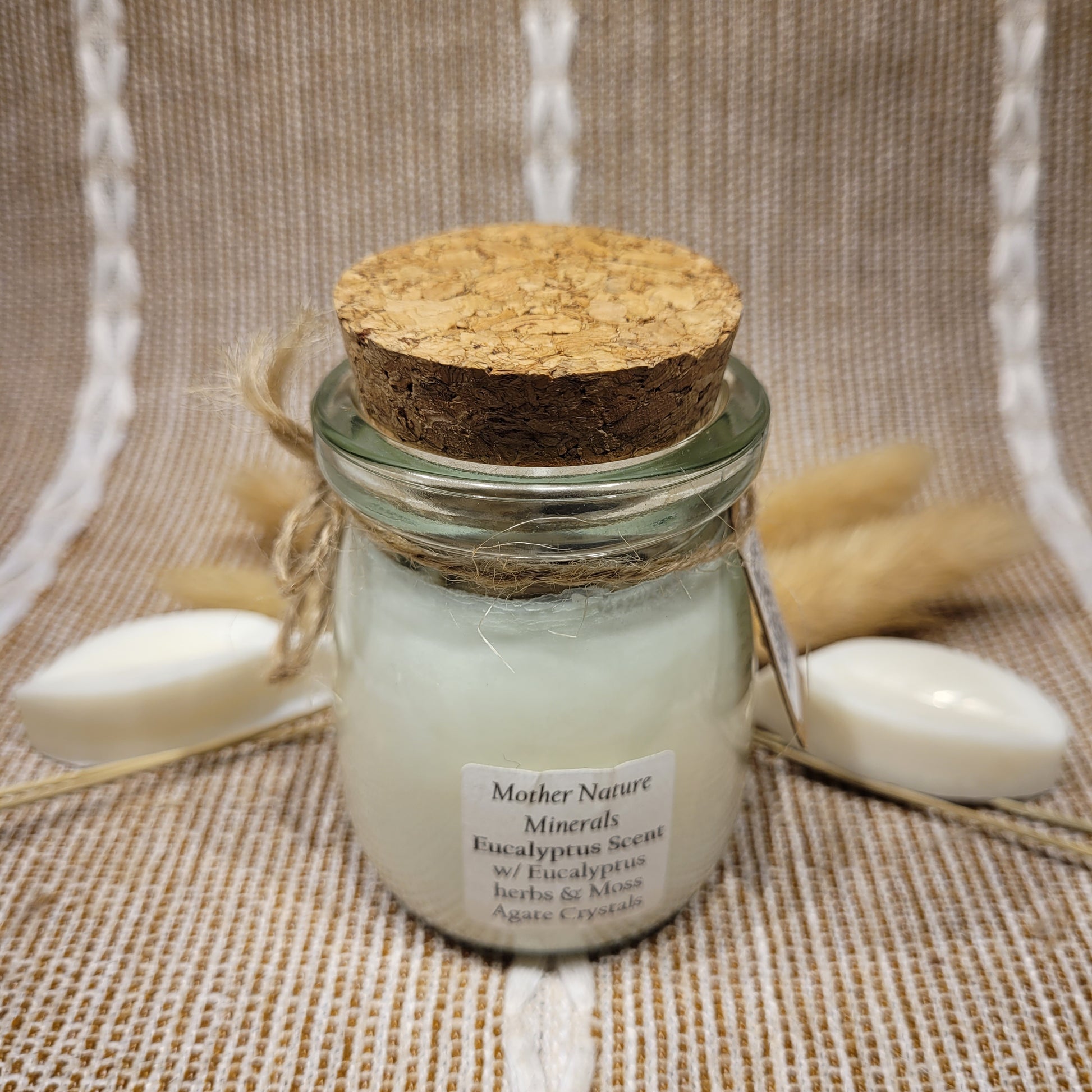 This candle has a lovely Eucalyptus scent and decorated with Eucalyptus herbs and Moss Agate crystal chips on top!