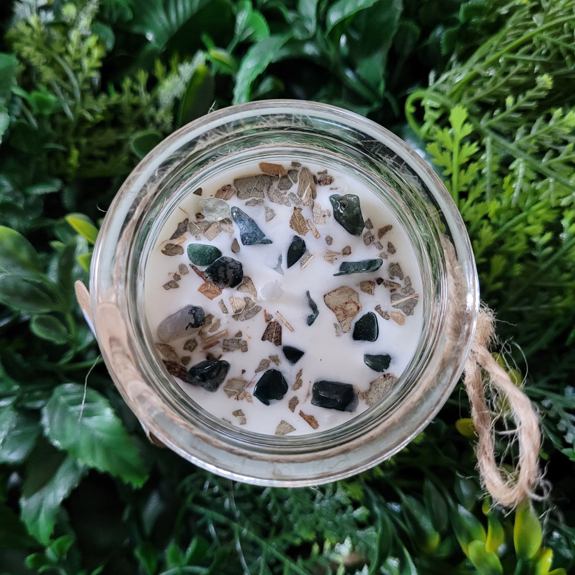 This candle has a lovely Eucalyptus scent and decorated with Eucalyptus herbs and Moss Agate crystal chips on top!