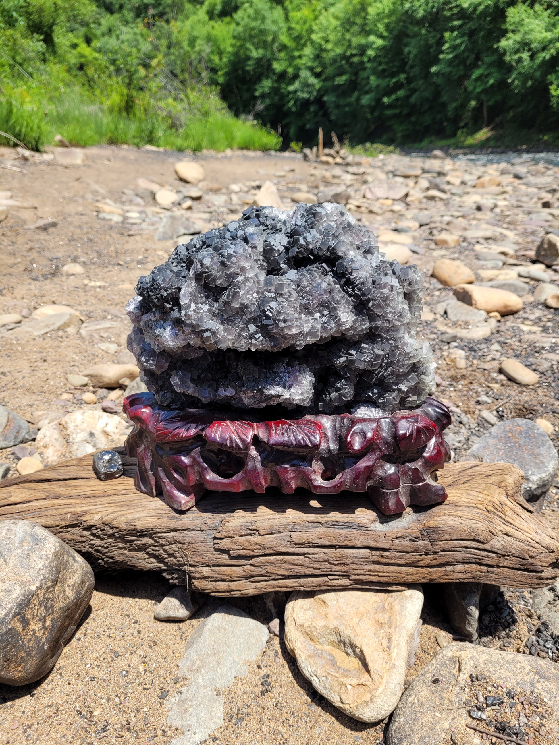 Huge Fluorite Cluster with gorgeous swirls of gray, green and purple fluorite, cubic formations, and on a customized wooden stand!