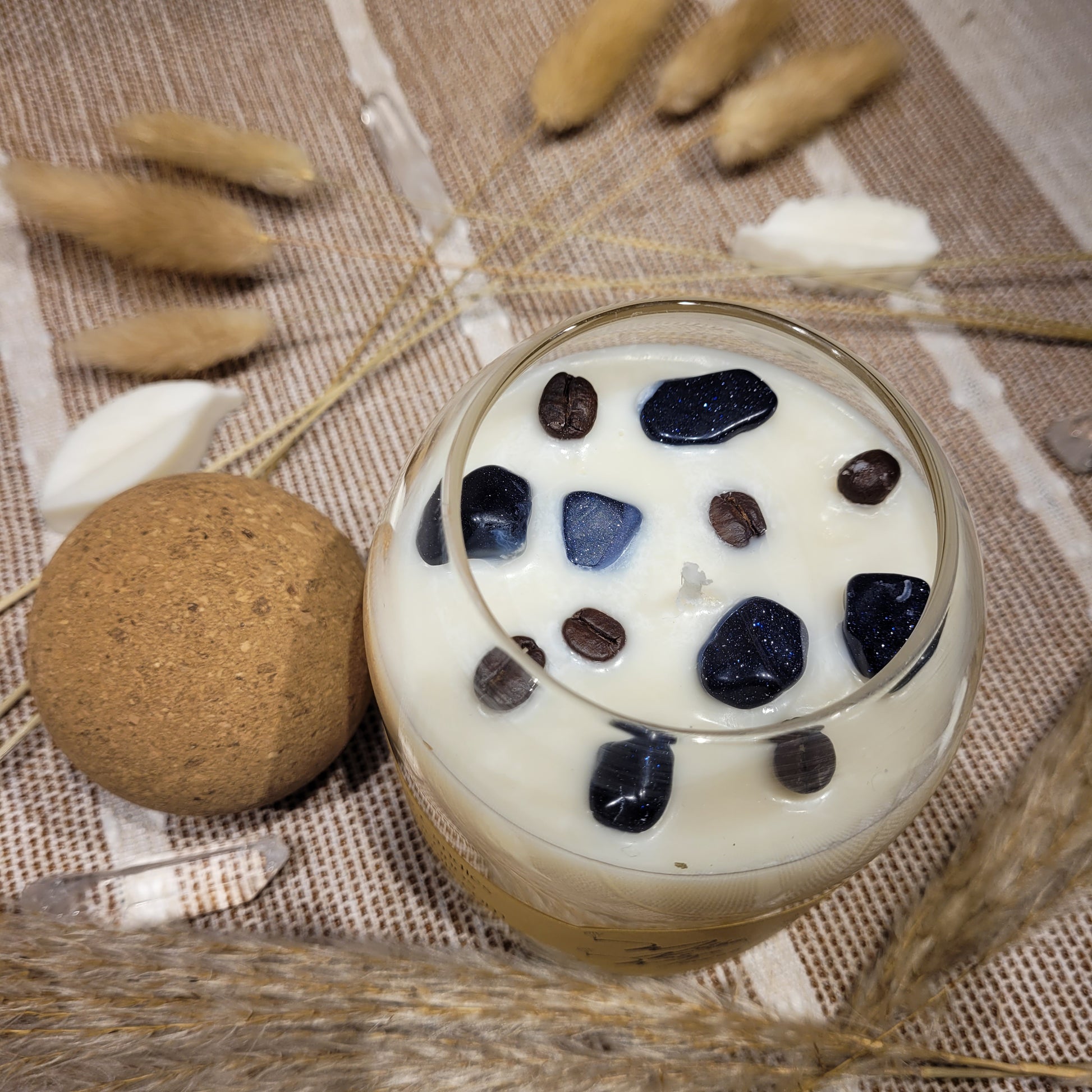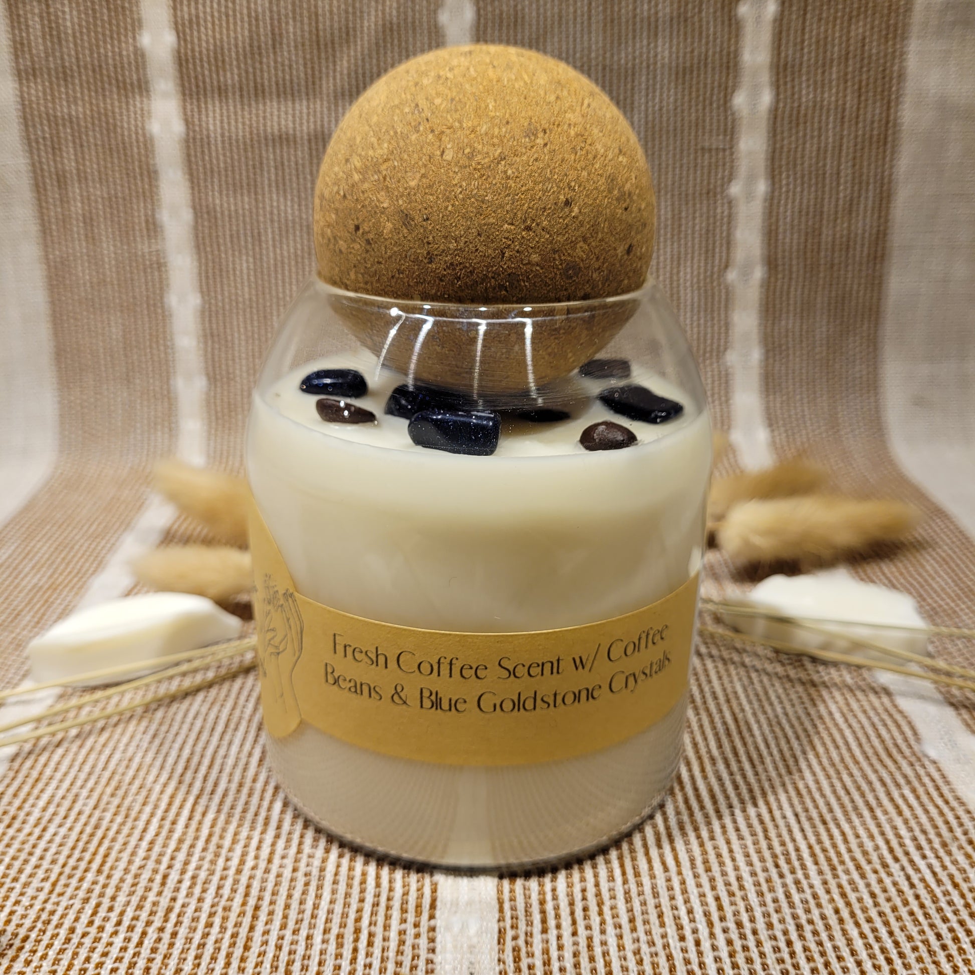 This candle has a lovely Fresh Coffee scent and decorated with whole coffee beans and Blue Goldstone Crystal chips on top!