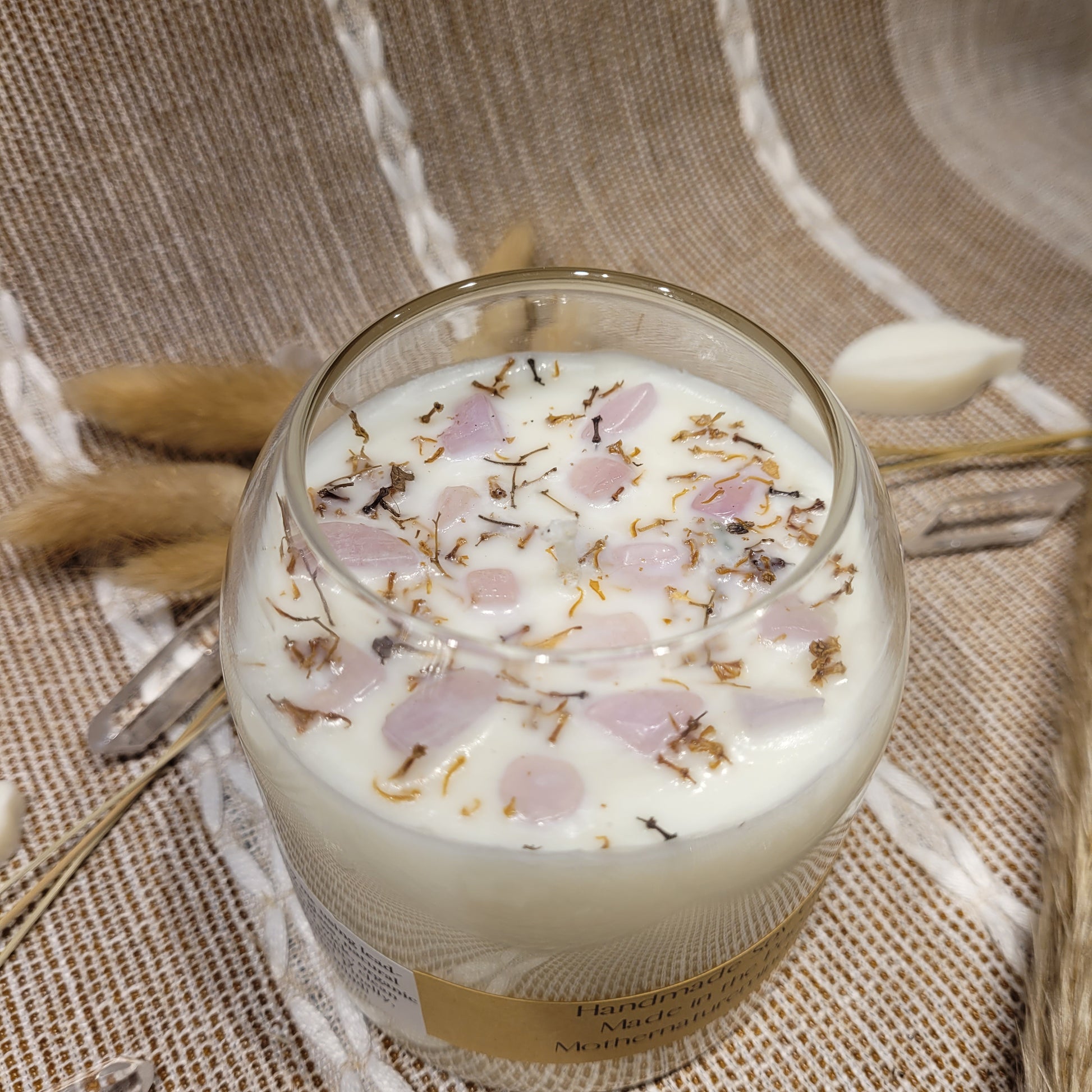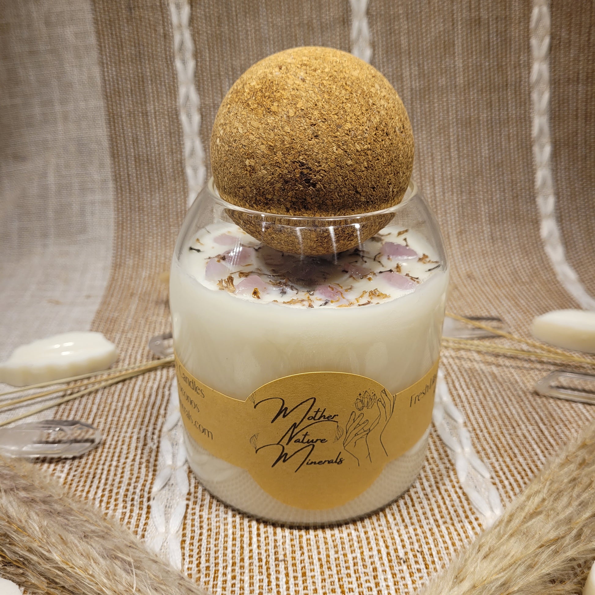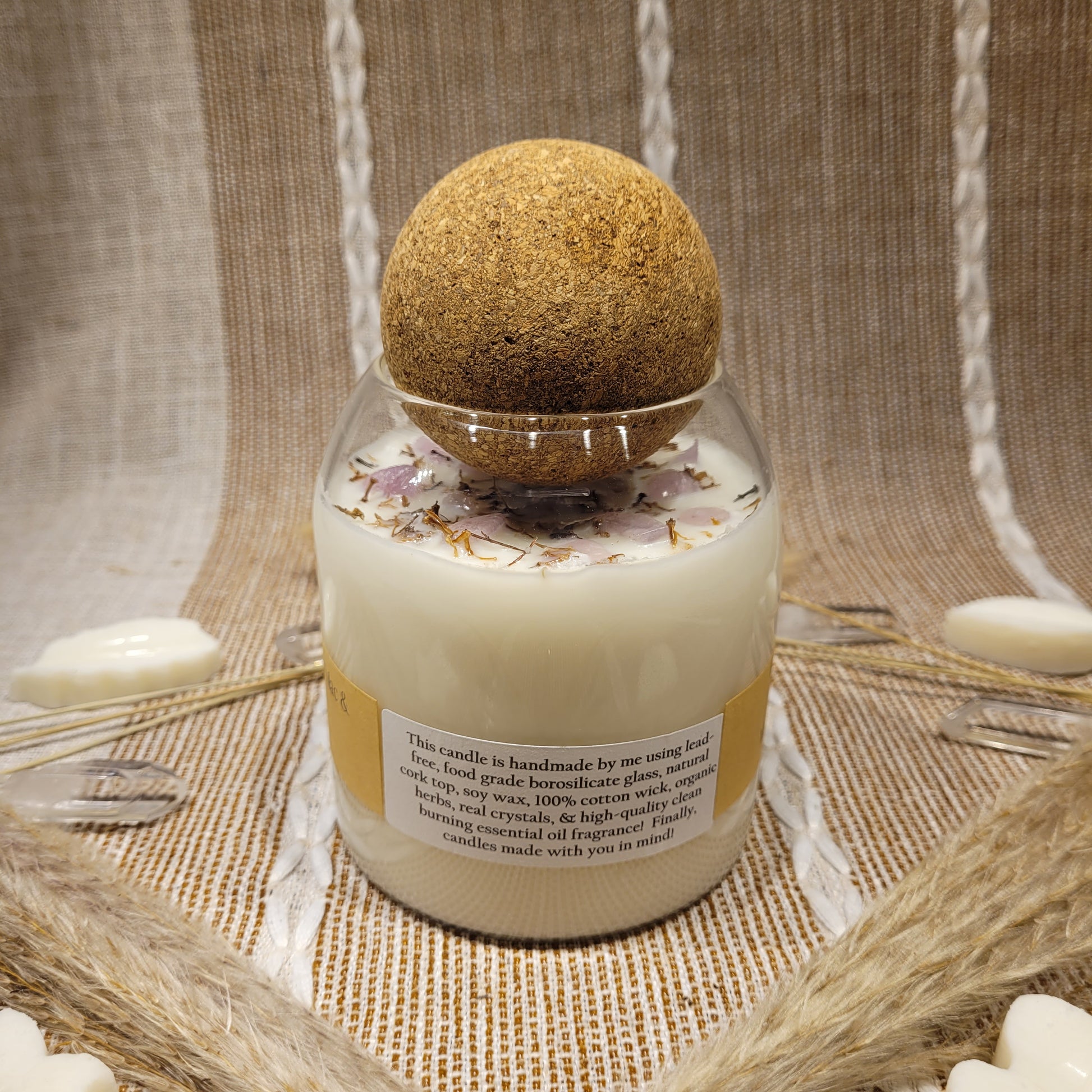 Handmade soy candles created with high-quality clean burning essential oil infused fragrance, 100% cotton wick, lead free borosilicate glass jar, decorated with organic dried herbs and ethically sourced crystals in a 17 oz Jar. Plus there is a hidden crystal on the bottom!