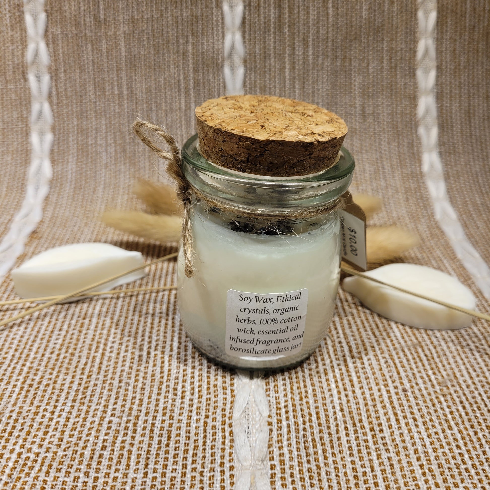 Handmade soy candles created with high-quality clean burning essential oil infused fragrance, 100% cotton wick, lead free borosilicate glass jar, decorated with organic dried herbs and ethically sourced crystals in a 3.4 oz Jar. Plus there is a hidden crystal on the bottom!