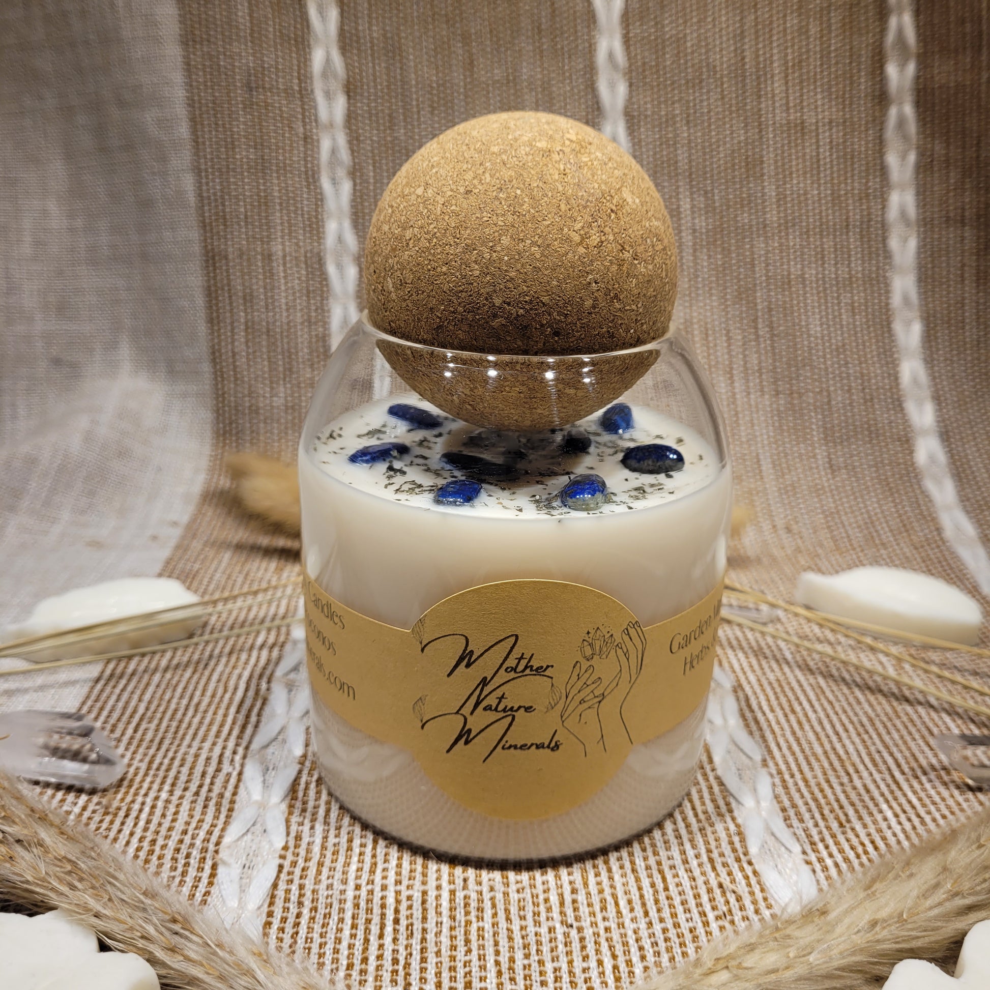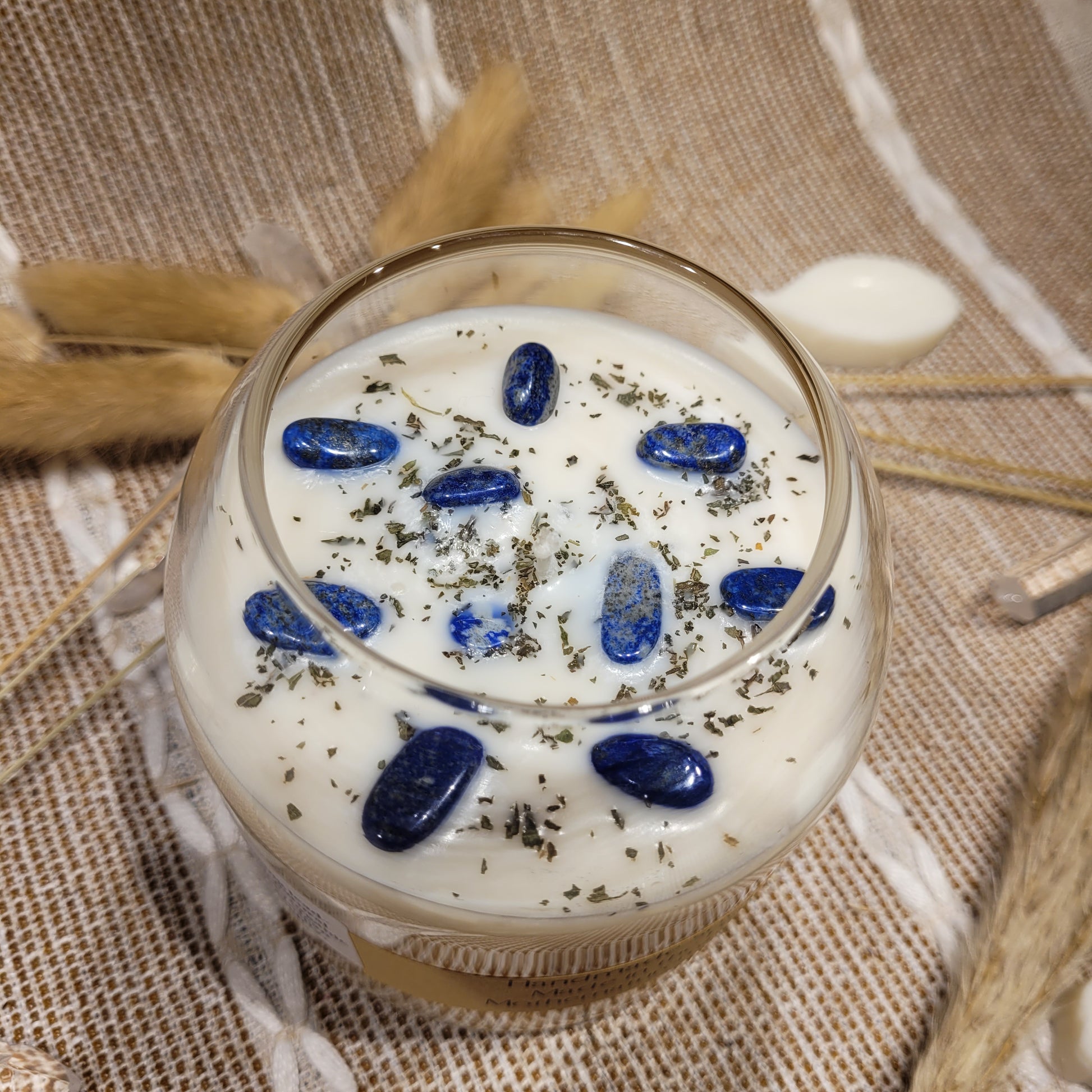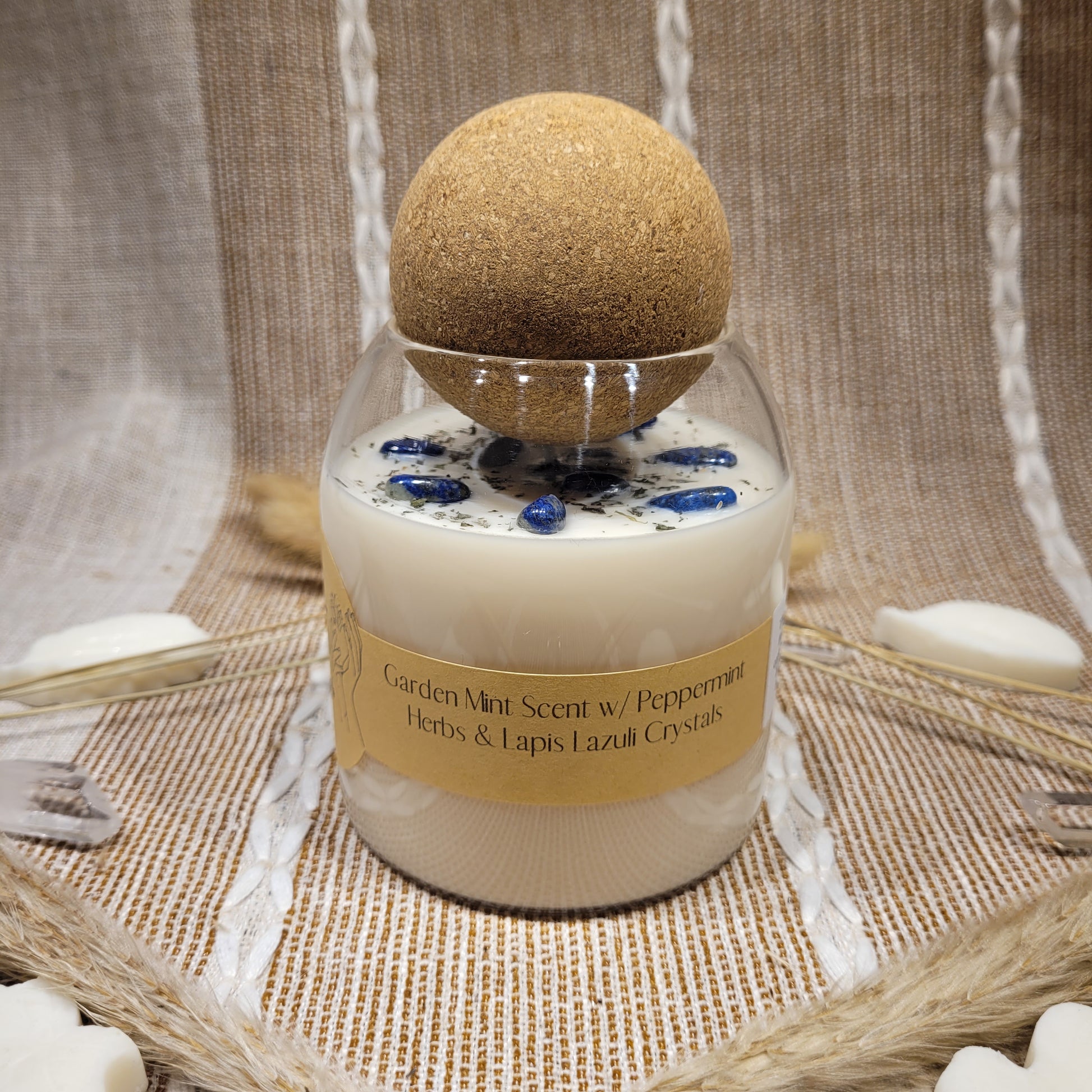 This candle has a lovely a Garden Mint scent and decorated with Peppermint herbs and Lapis Lazuli crystal chips on top!
