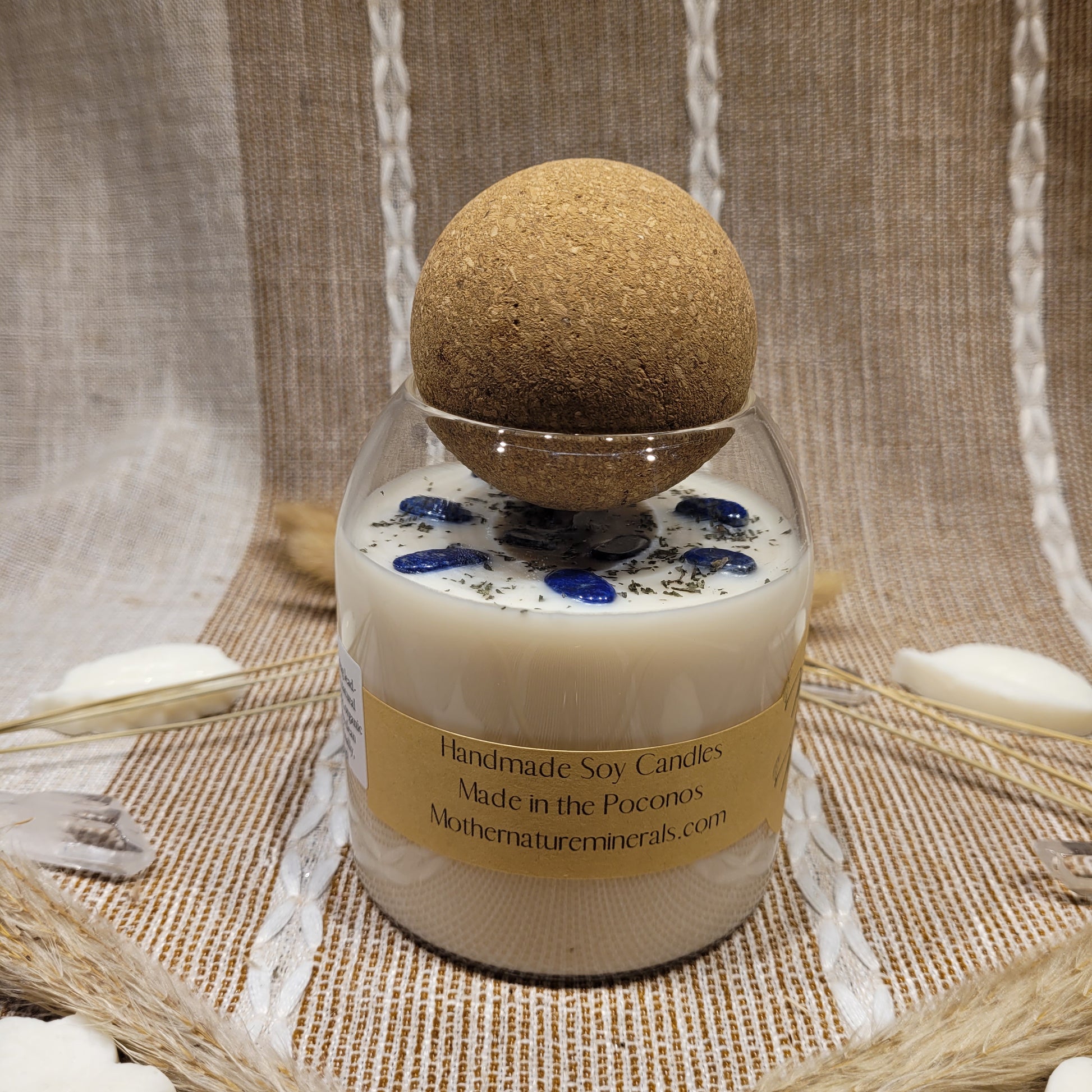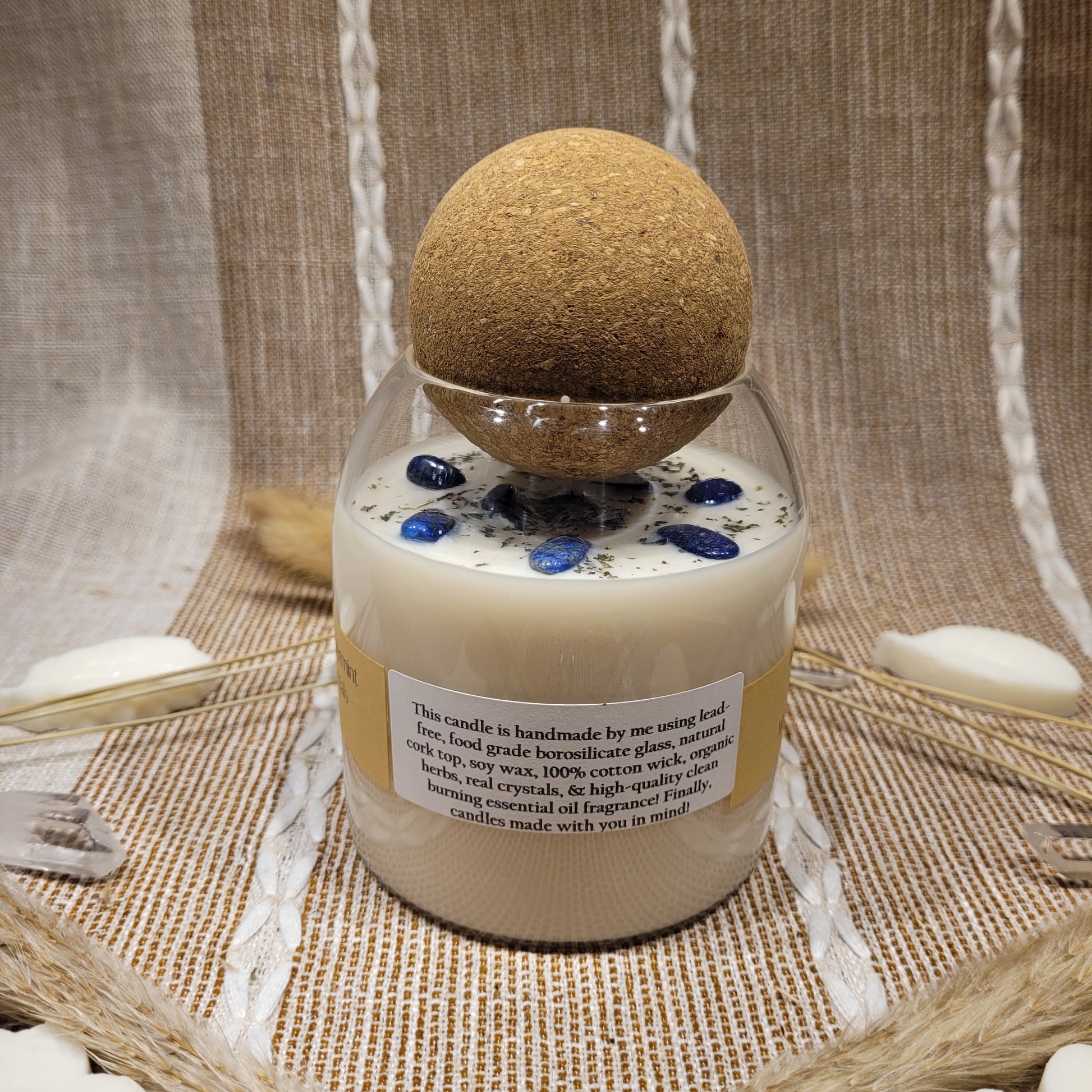 Handmade soy candles created with high-quality clean burning essential oil infused fragrance, 100% cotton wick, lead free borosilicate glass jar, decorated with organic dried herbs and ethically sourced crystals in a 17 oz Jar. Plus there is a hidden crystal on the bottom!