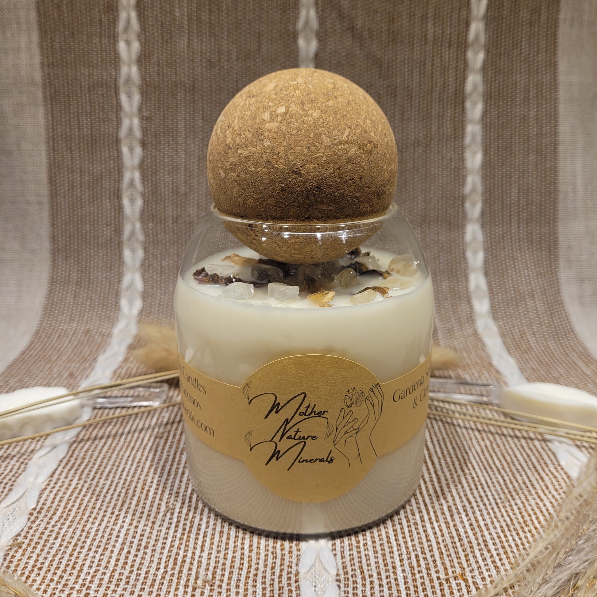 This candle has a lovely Gardenia scented candle and decorated with Gardenia Herbs and Clear Quartz crystal chips on top!