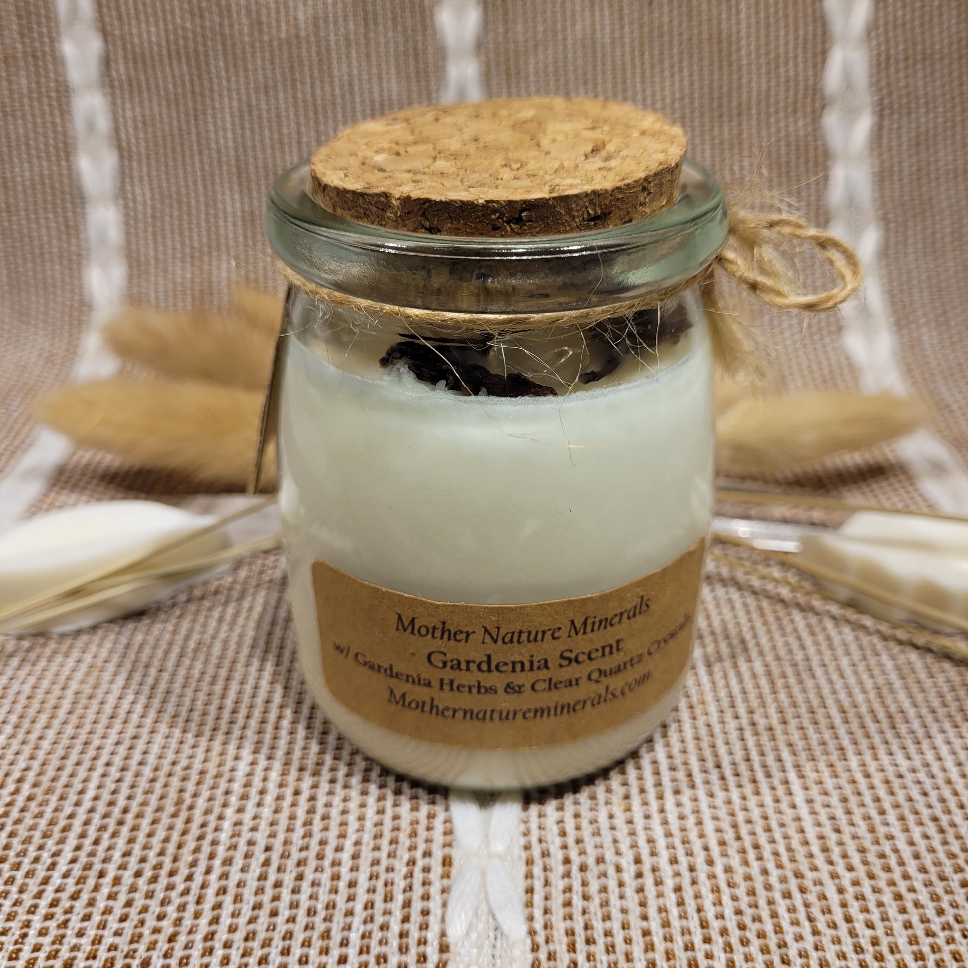 This candle has a lovely Gardenia scented candle and decorated with Gardenia Herbs and Clear Quartz crystal chips on top!