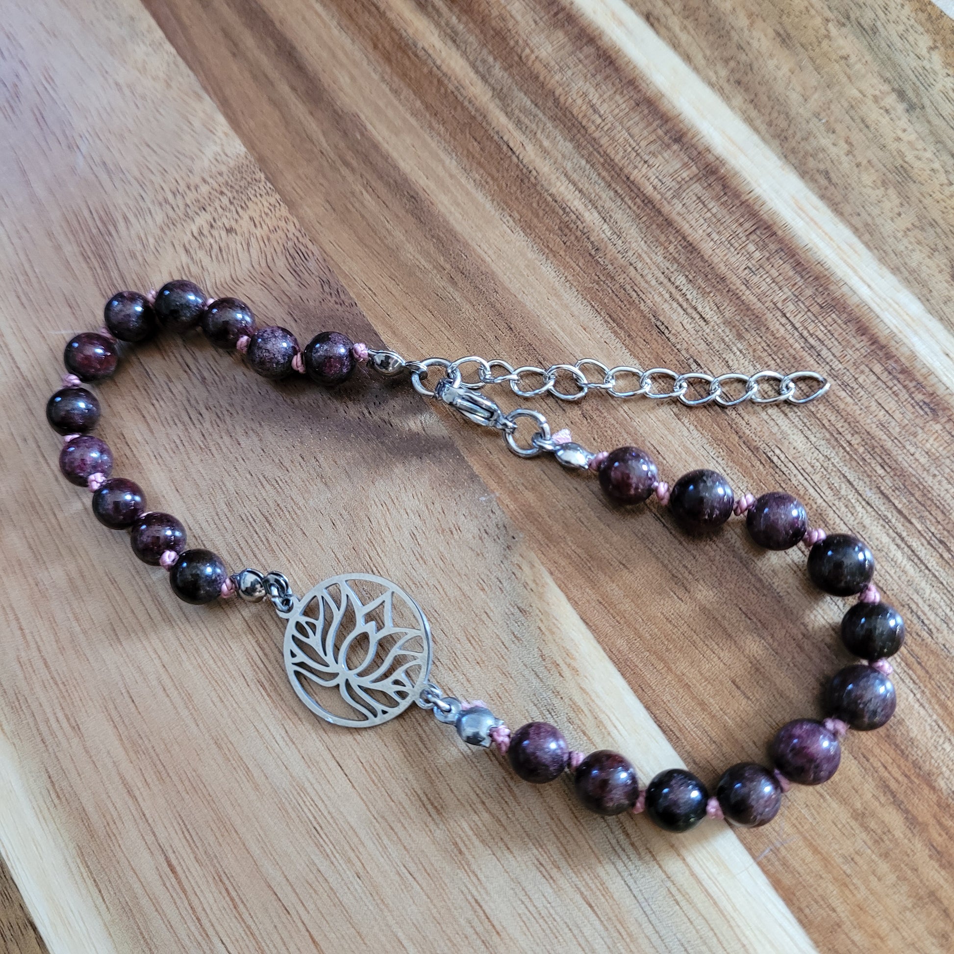 I created this anklet with Garnet crystals, lotus stainless steel pendant, handknotted with 100% natural silk, and stainless steel adjustable chain!