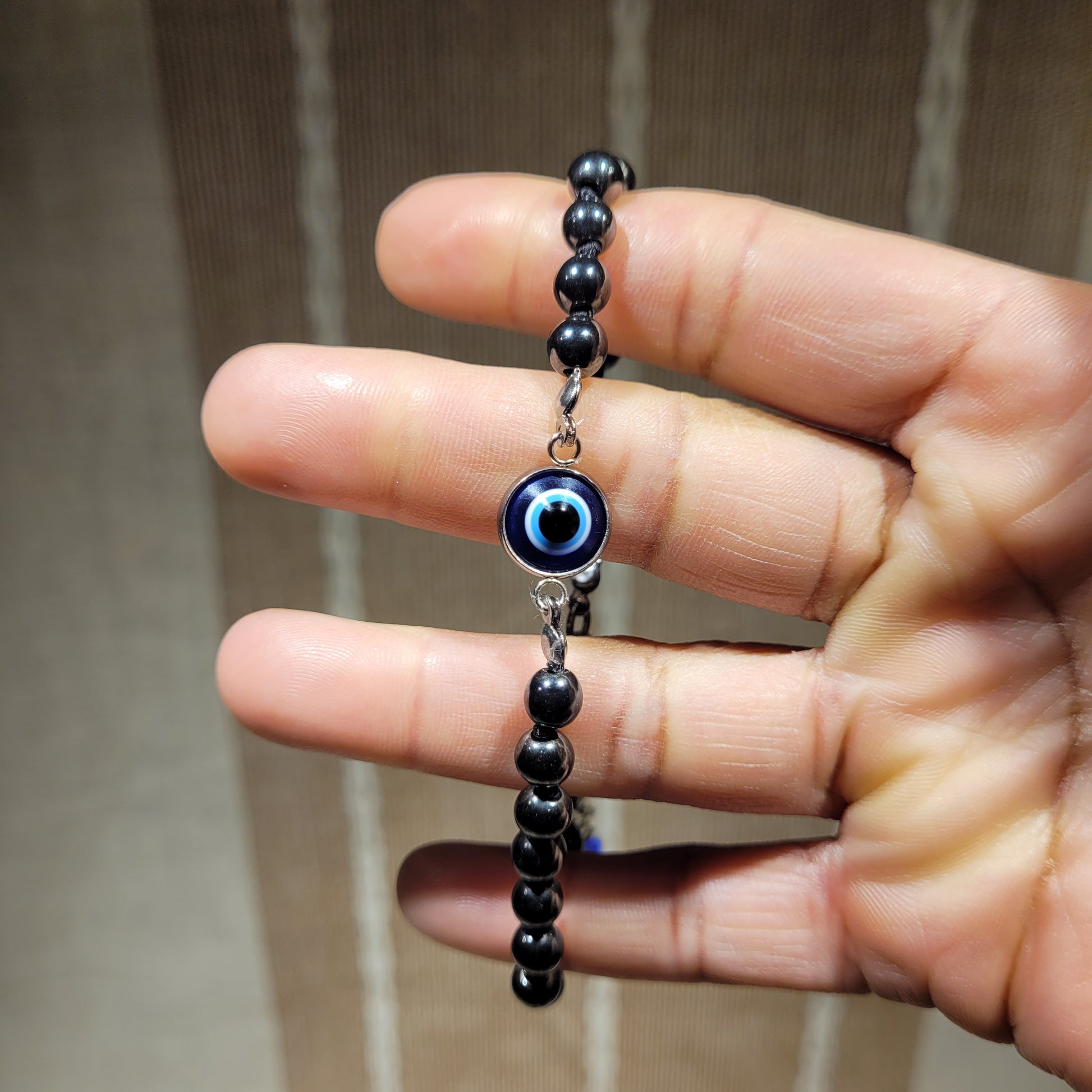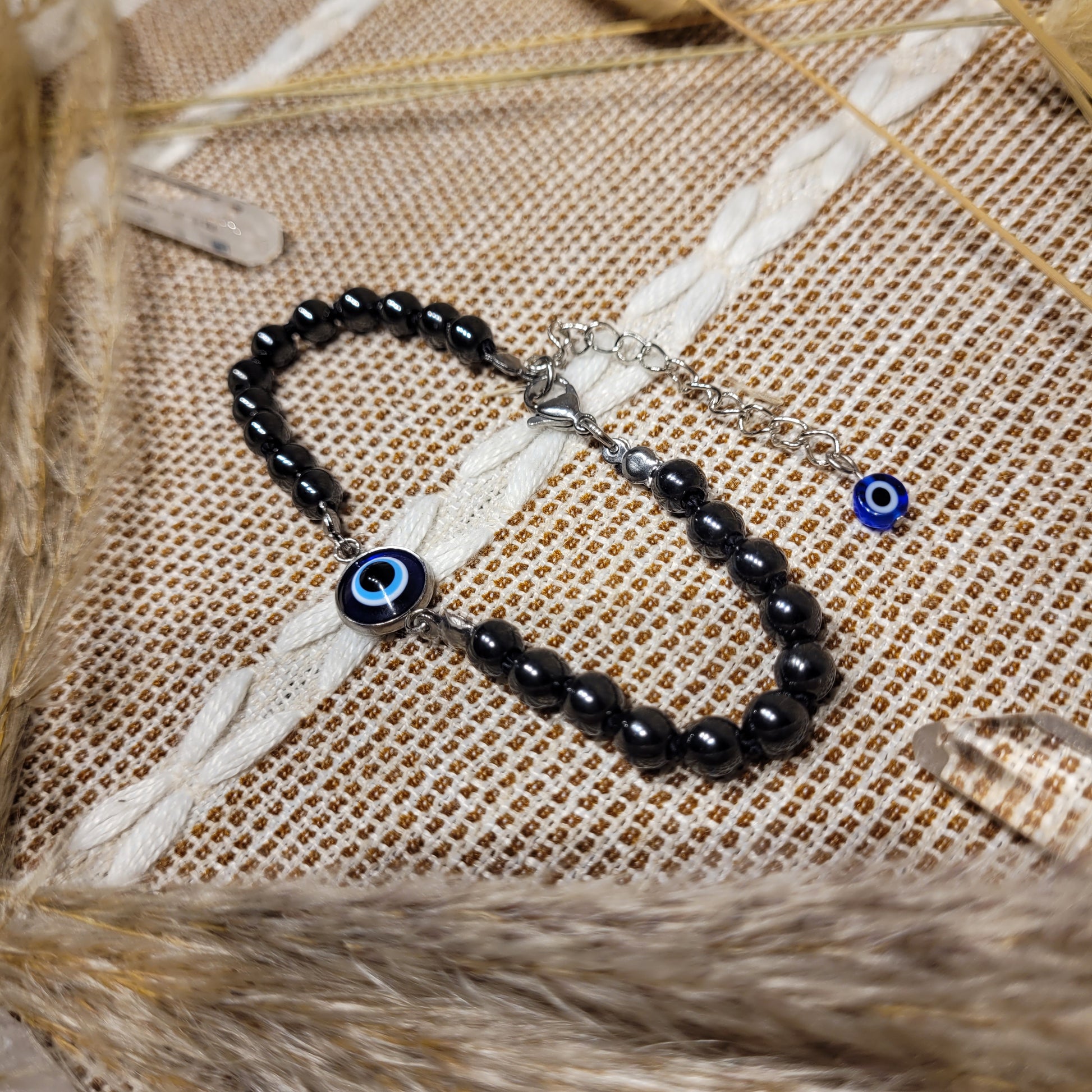 I created this Hematite Evil Eye Anklet with Hematite crystals, resin Evil eye on stainless steel pendant, handknotted with 100% natural silk, and stainless steel adjustable chain with mini evil eye glass bead!
