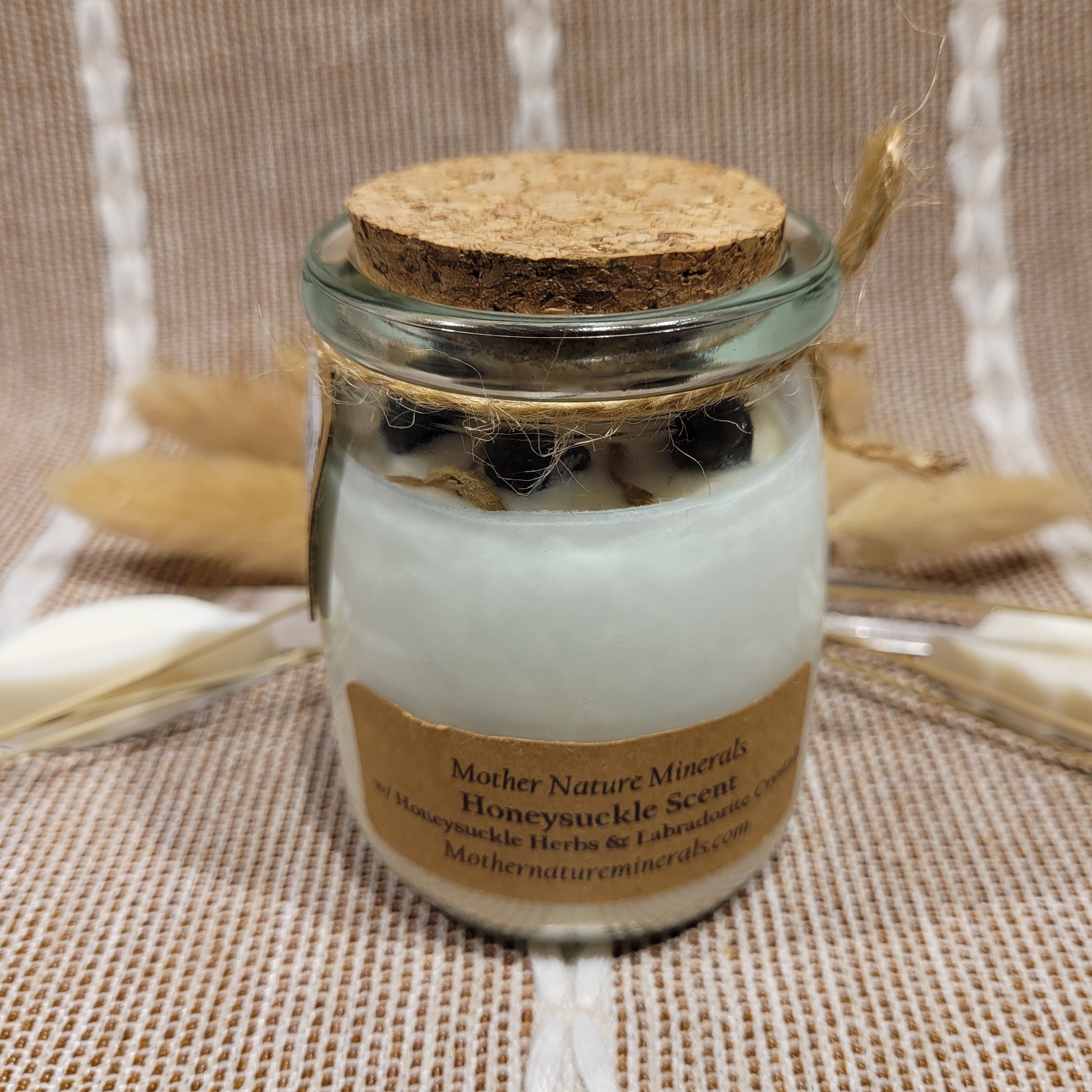 This candle has a lovely Honeysuckle scent and is decorated with Honeysuckle herbs and Labradorite crystal chips on top!