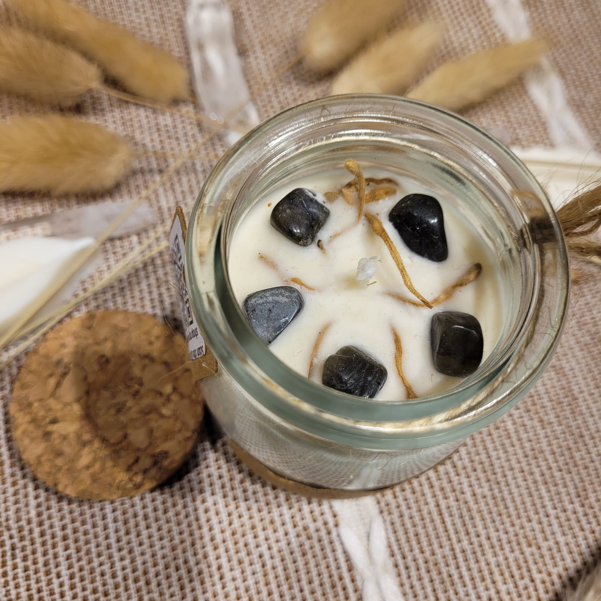 Handmade soy candles created with high-quality clean burning essential oil infused fragrance, 100% cotton wick, lead free borosilicate glass jar, decorated with organic dried herbs and ethically sourced crystals in a 7 oz Jar. Plus there is a hidden crystal on the bottom!