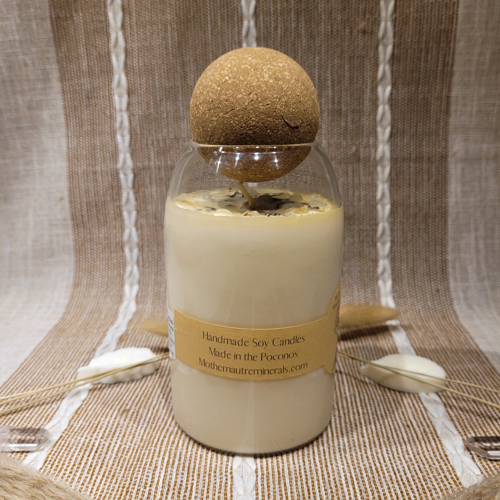 Handmade soy candles created with high-quality clean burning essential oil infused fragrance, 100% cotton wick, lead free borosilicate glass jar, decorated with organic dried herbs and ethically sourced crystals in a 25 oz Jar. Plus there is a hidden crystal on the bottom!