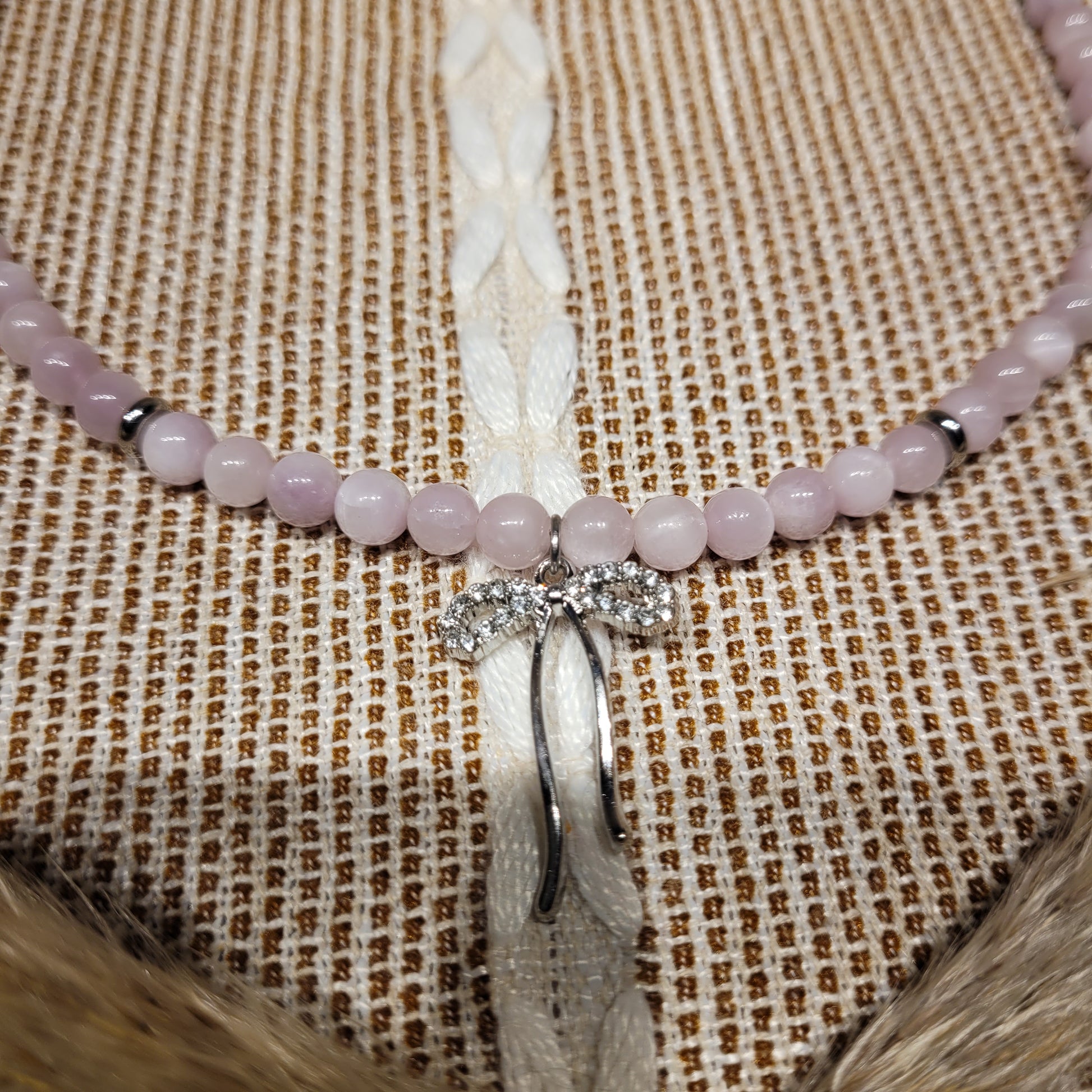 I created this stunning Kunzite Necklace with high quality flash Kunzite crystal beads, stainless steel bow with cubic zirconia, and stainless steel clasp!