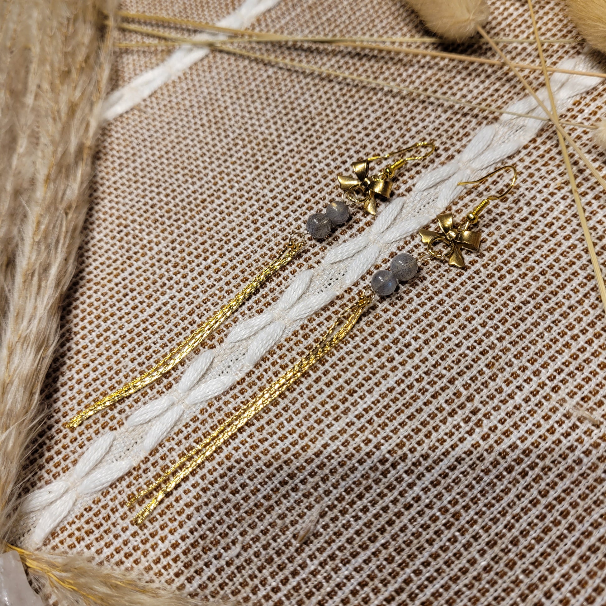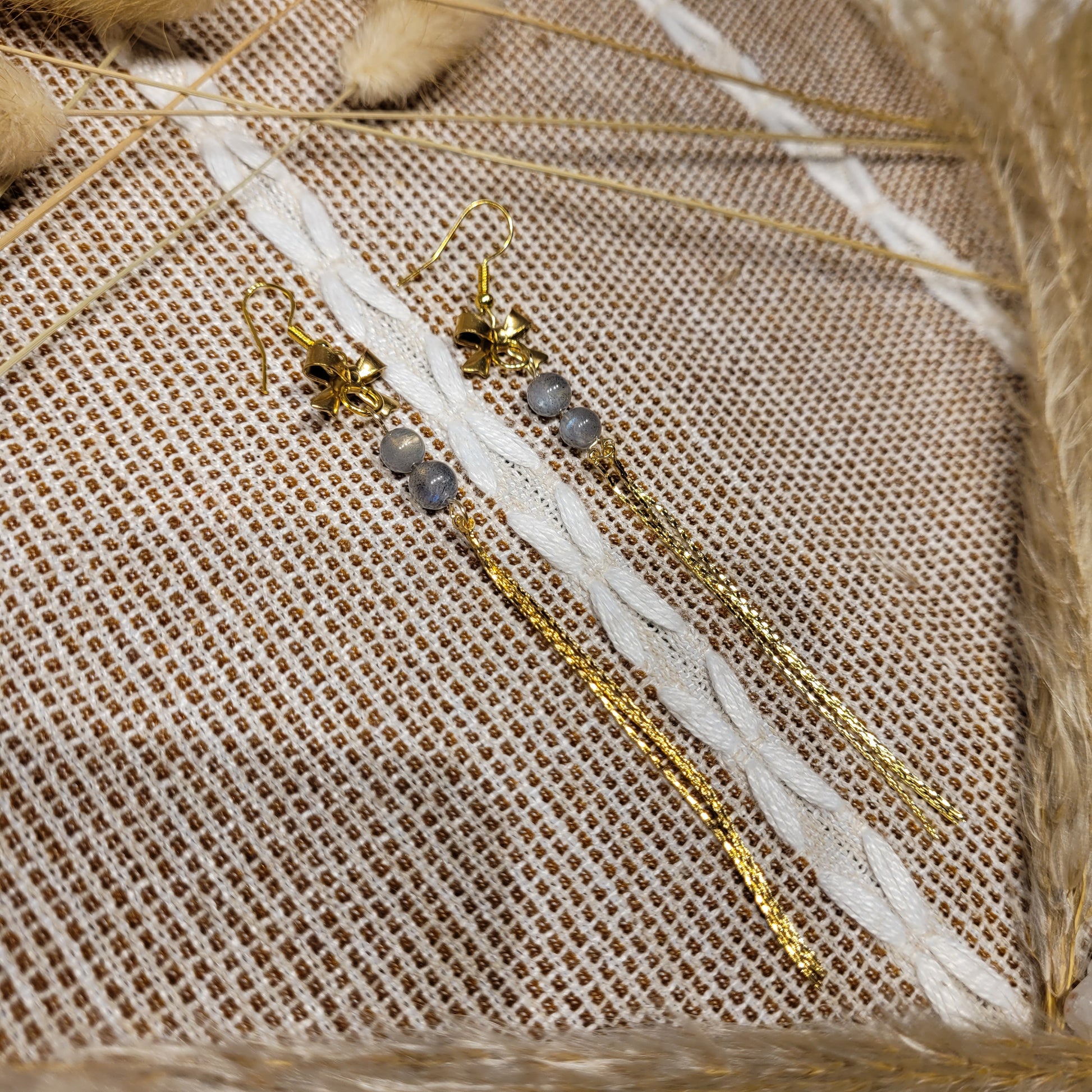 I created these lovely Labradorite Earrings with high quality Labradorite crystal beads, gold stainless steel bow and fringe charms, and gold plated steel hooks!