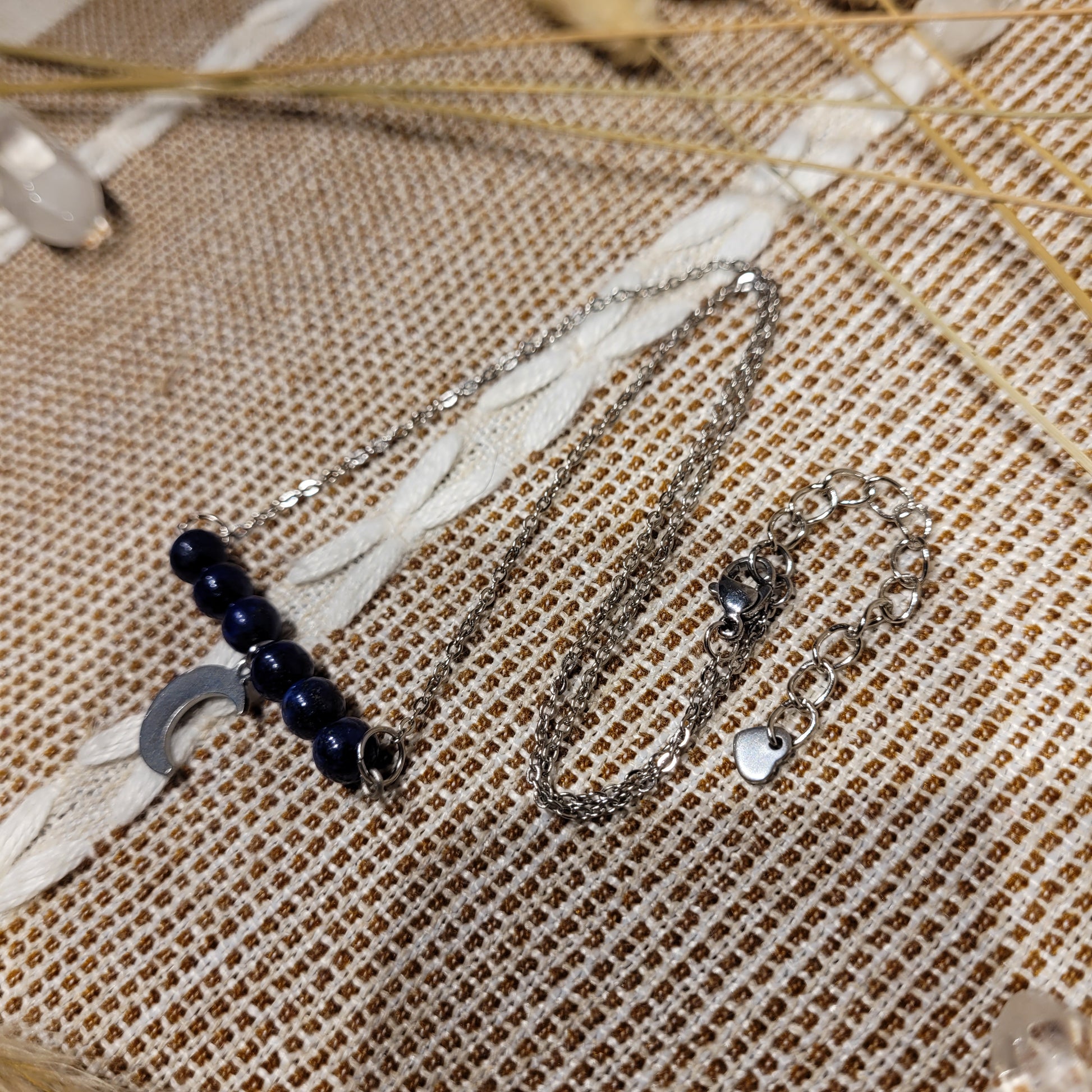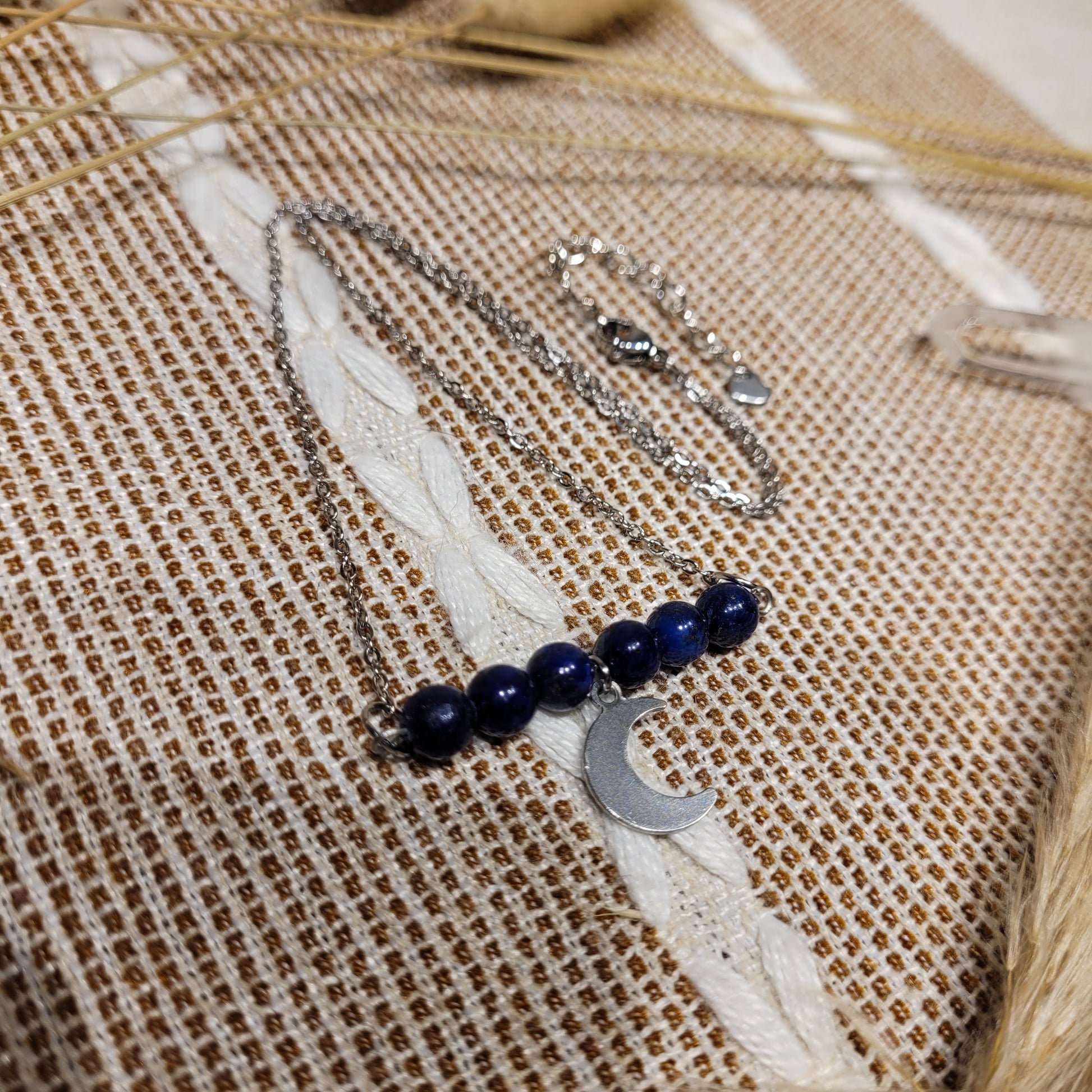 I created this stunning Lapis Lazuli Necklace with stainless steel moon charm, stainless steel chain and clasp wirh heart charm, and Lapis Lazuli crystal beads! Stunning choker/collar bone length!