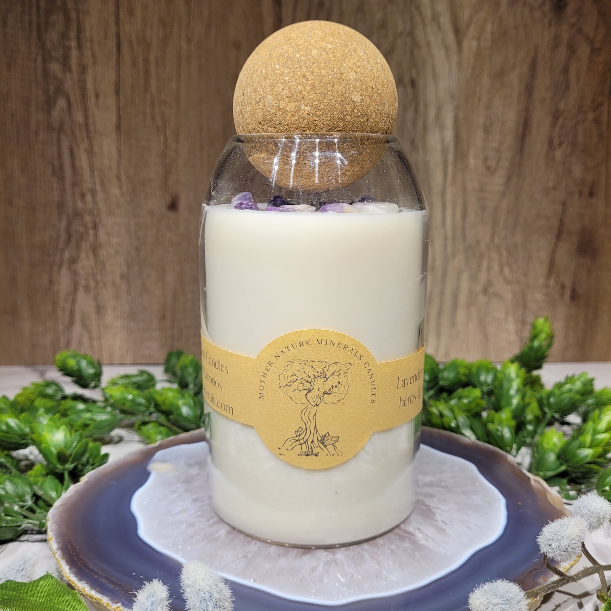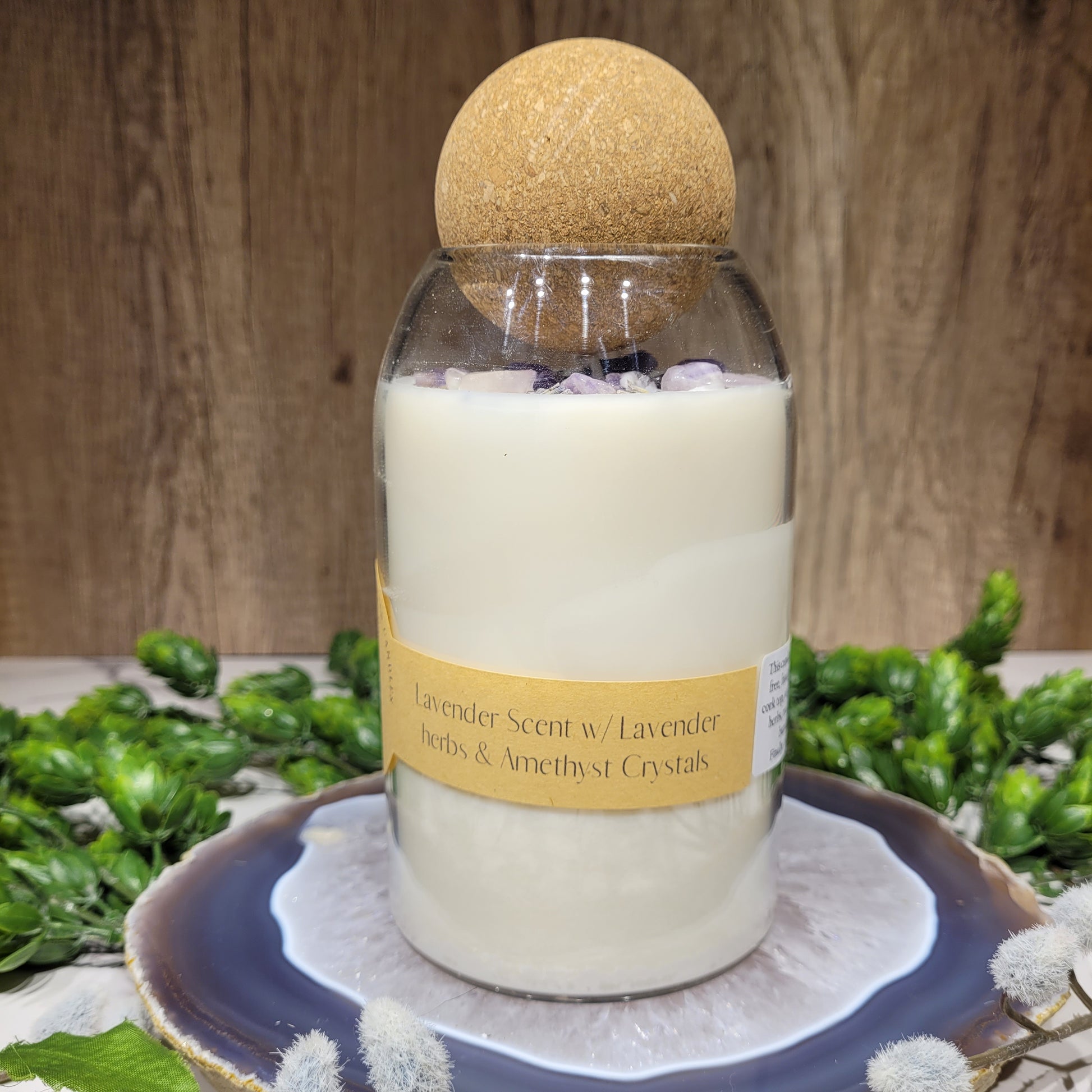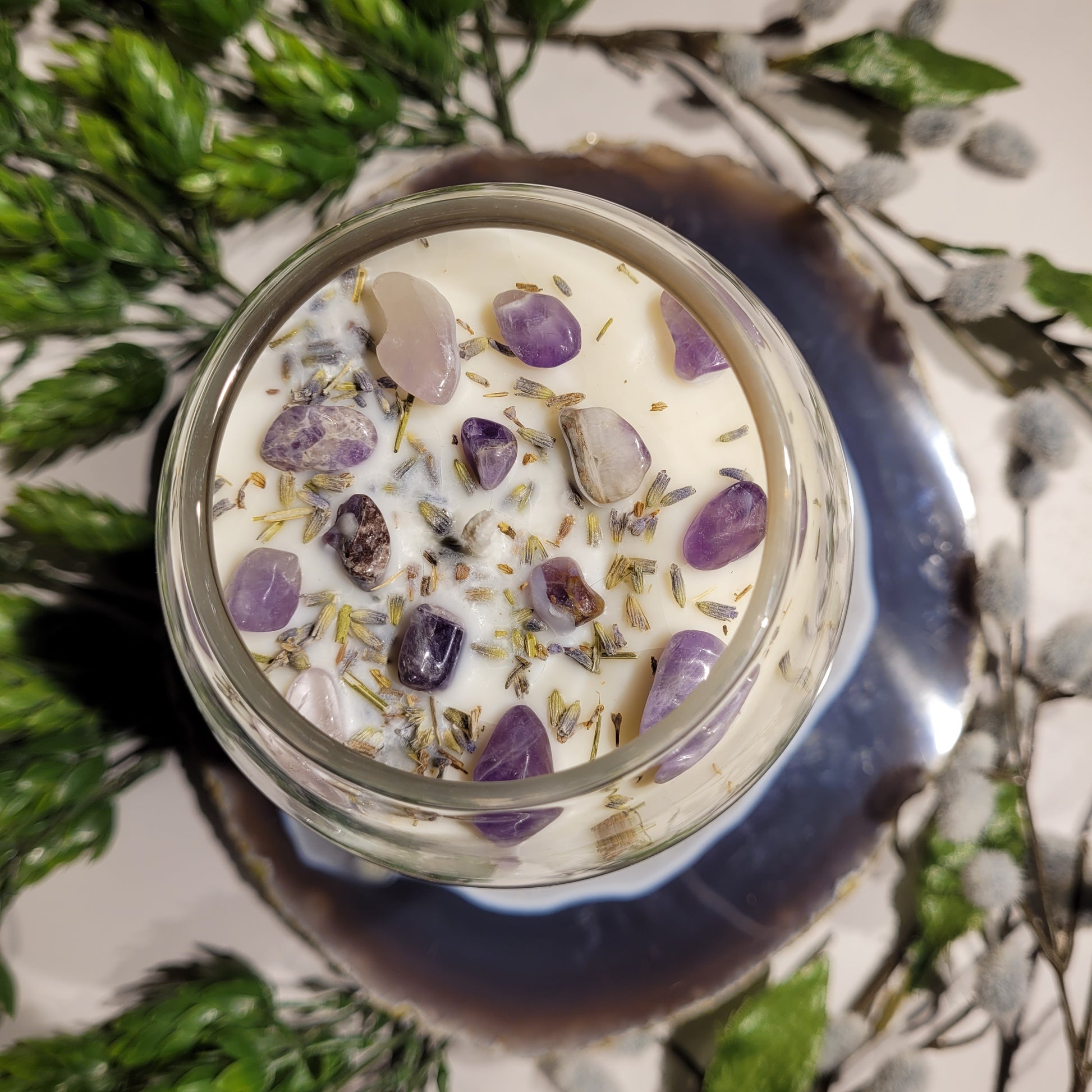 This candle has a lovely Lavender scent and is decorated with Lavender herbs and Amethyst crystal chips on top!