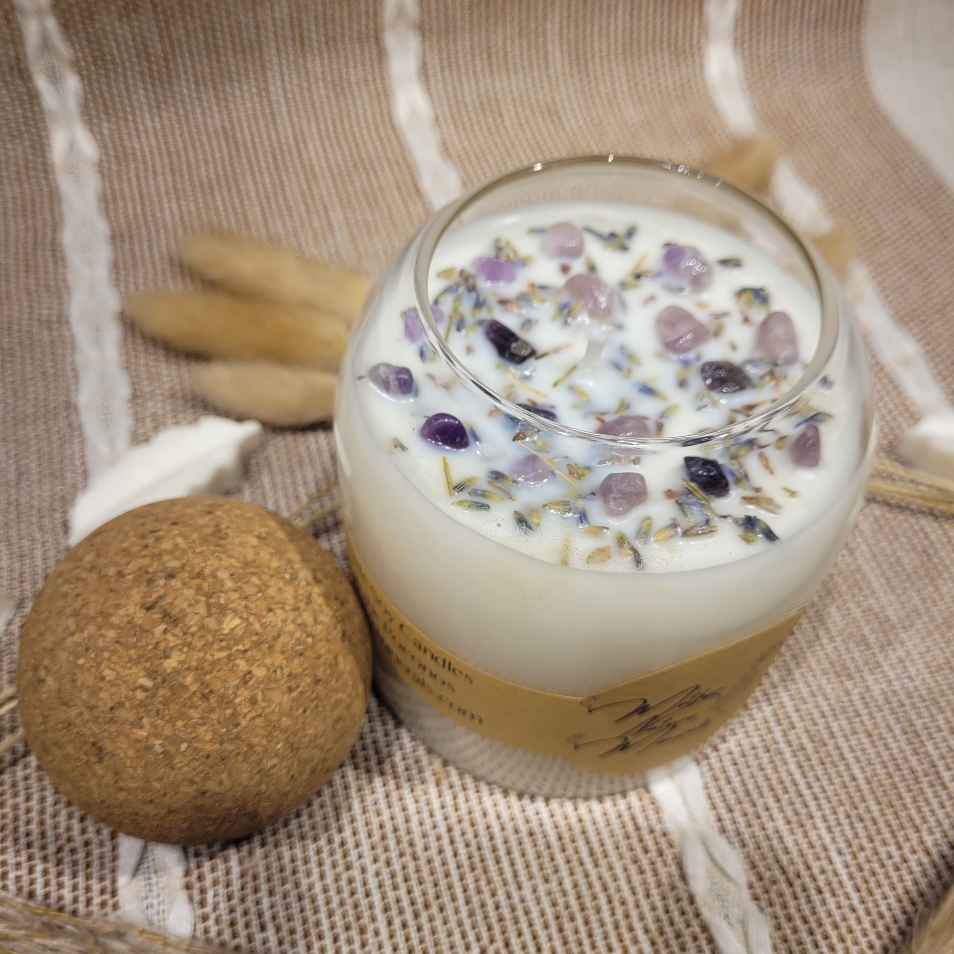This candle has a lovely Lavender scent and is decorated with Lavender herbs and Amethyst crystal chips on top!
