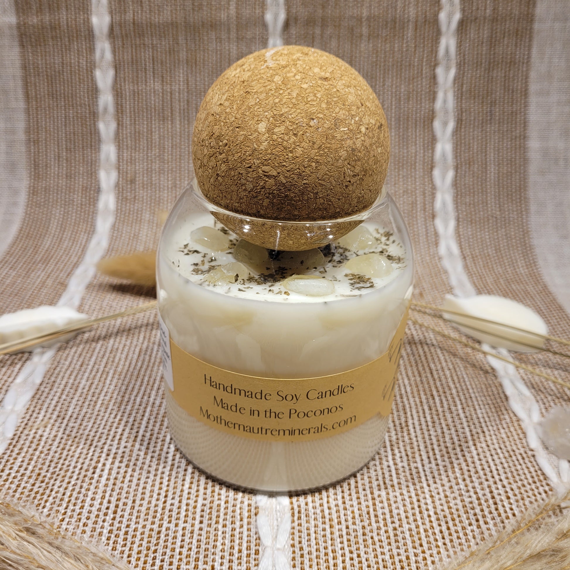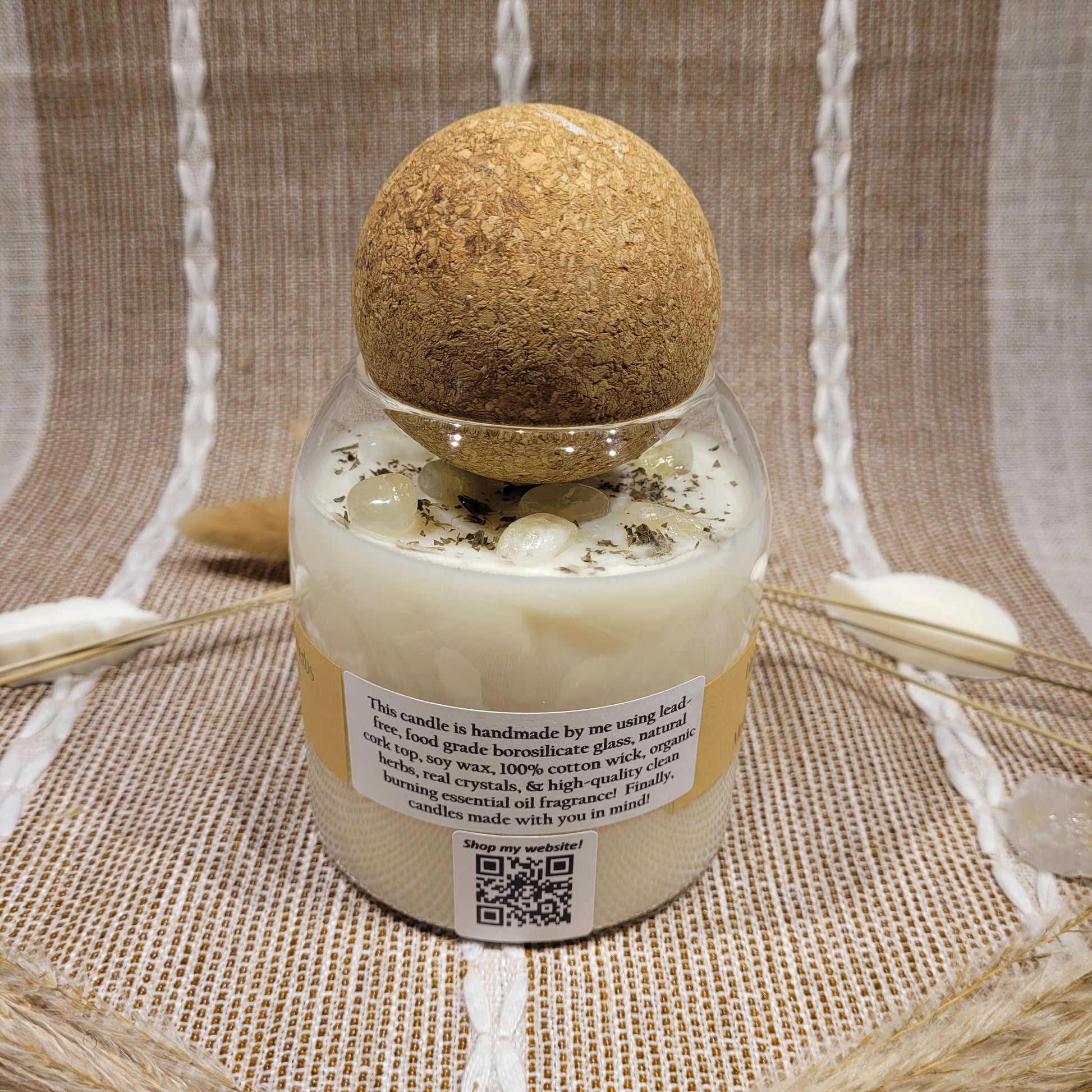Handmade soy candles created with high-quality clean burning essential oil infused fragrance, 100% cotton wick, lead free borosilicate glass jar, decorated with organic dried herbs and ethically sourced crystals in a 17 oz Jar. Plus there is a hidden crystal on the bottom!