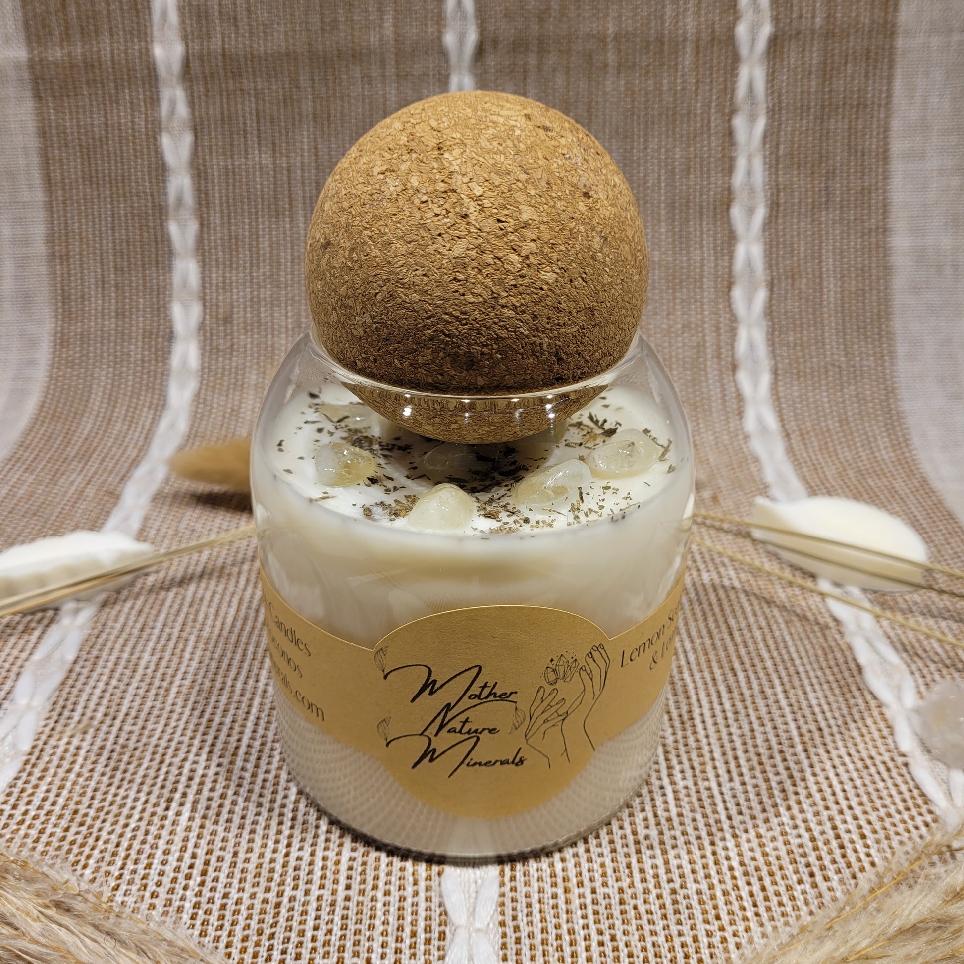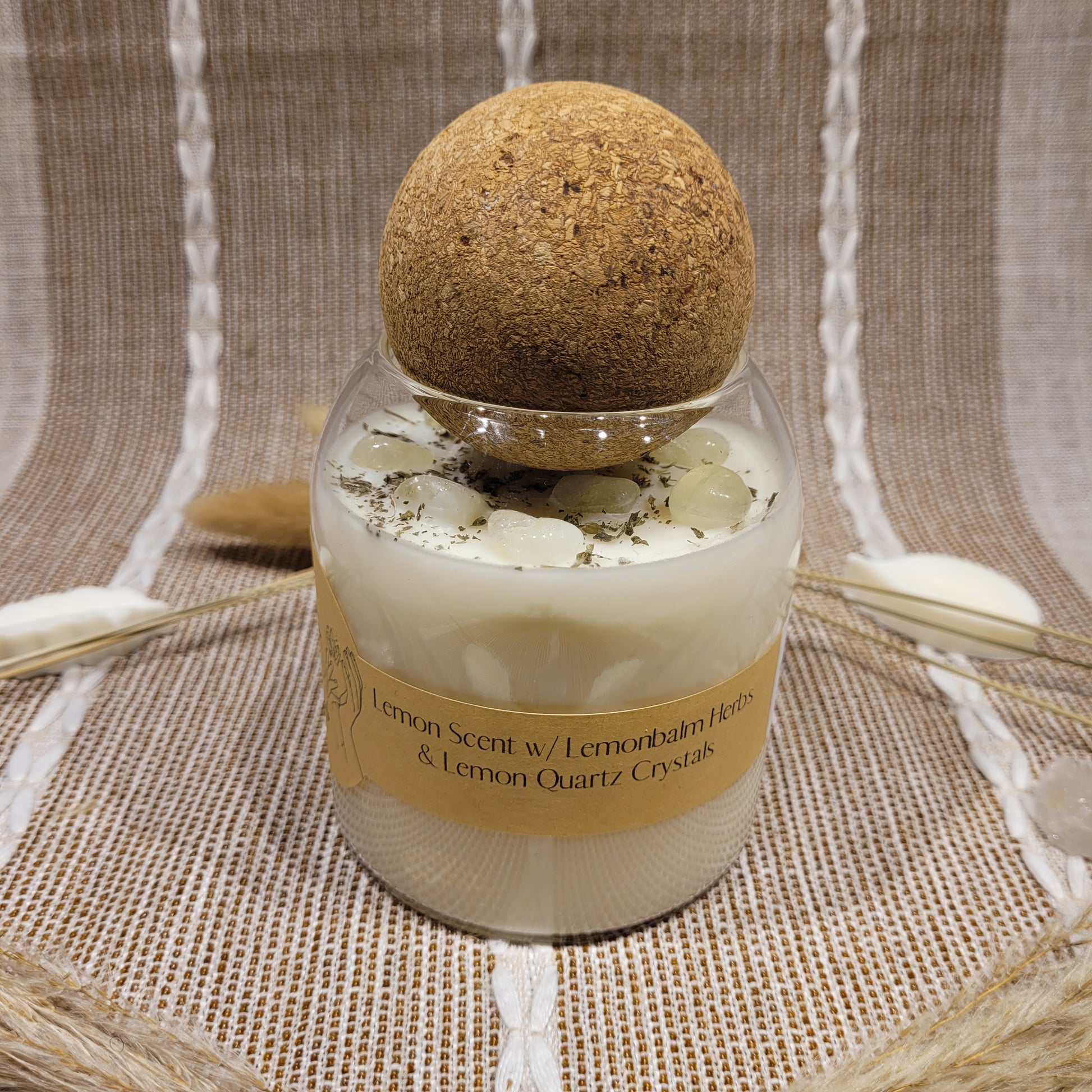 This candle has a lovely Lemon scent and is decorated with Lemon balm herbs and Lemon Quartz Crystal chips on top!