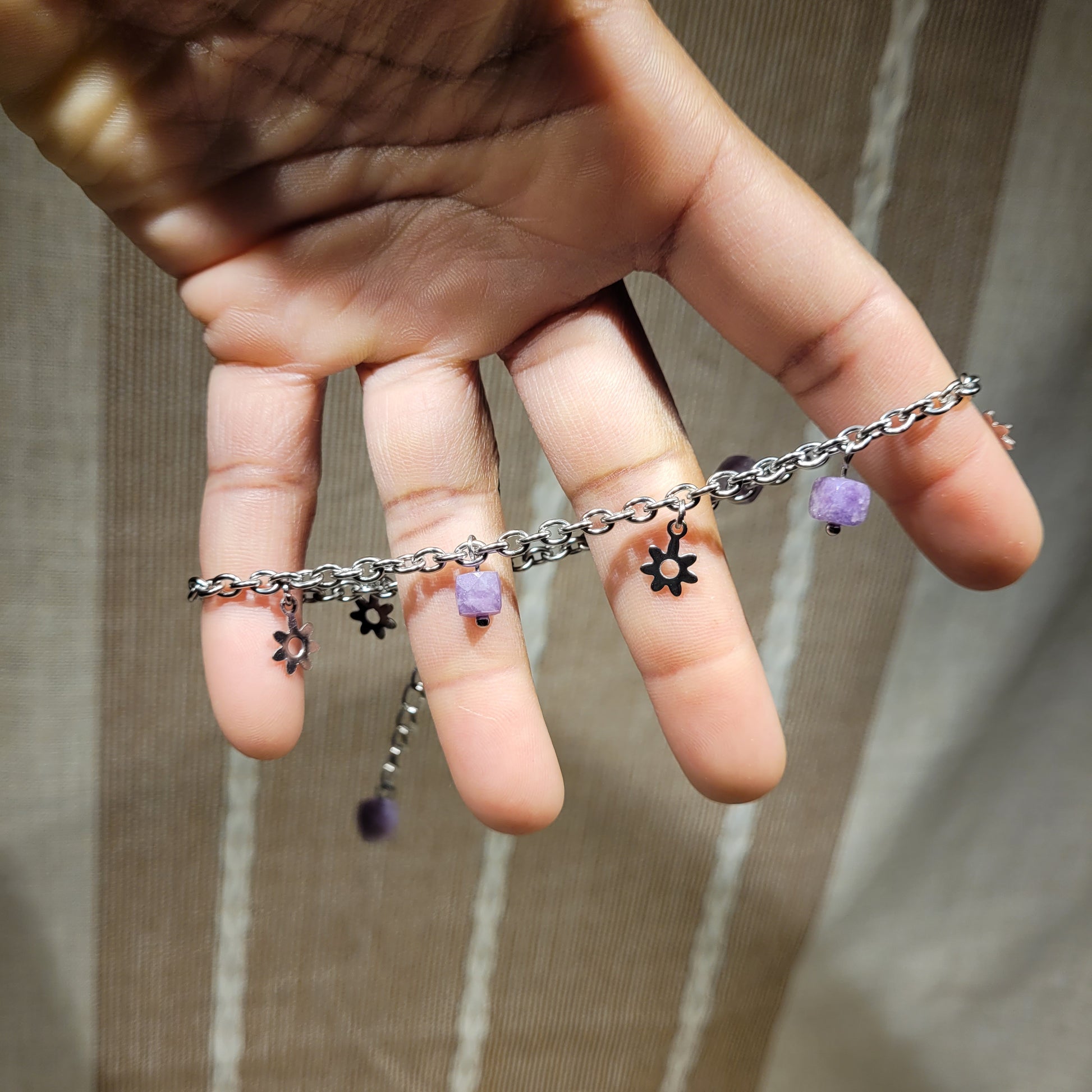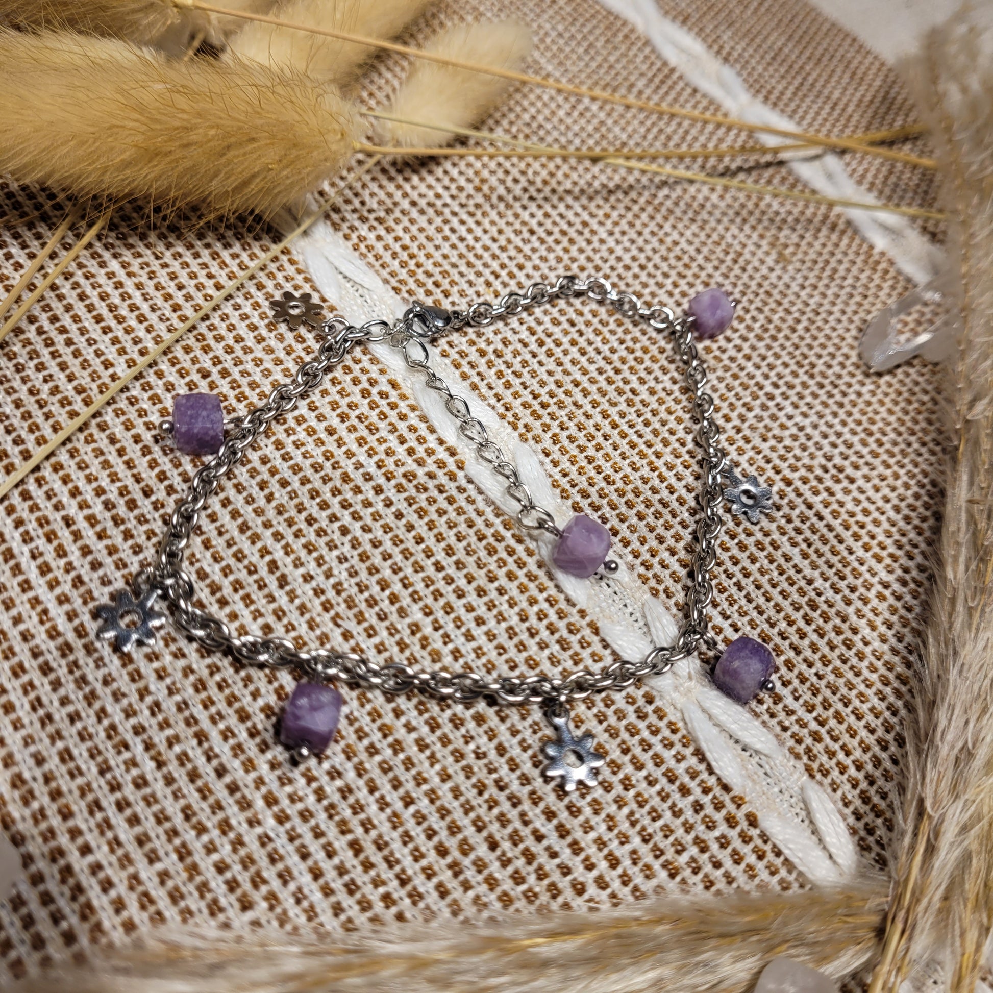 I made this beautiful anklet with ethically sourced Lilac Lepidolite Jasper, high-quality stainless steel chain, and stainless steel flower charms!