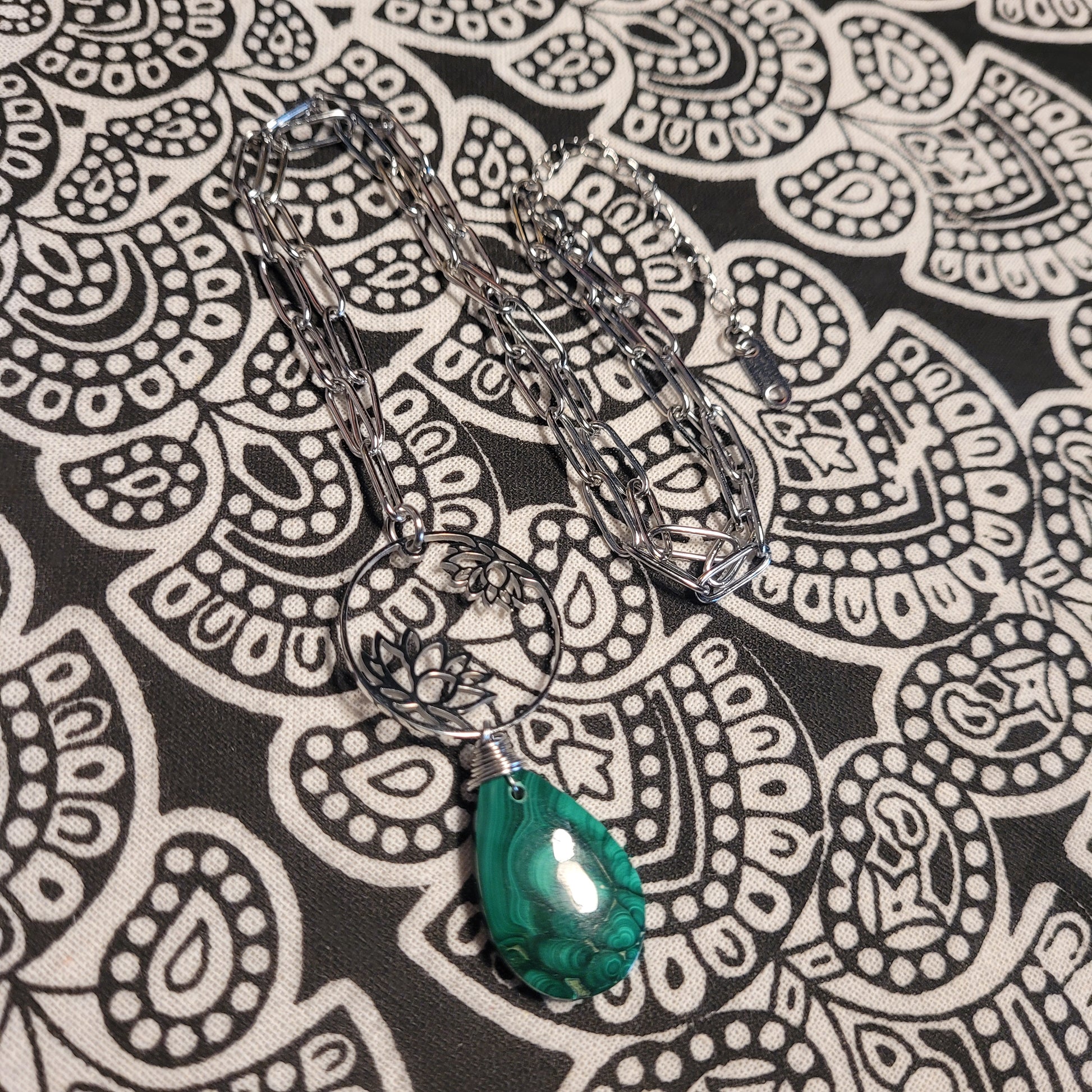 I created this high quality Malachite necklace with stainless steel chain, stainless steel hoop lotus leaf charm, and the Malachite crystal is ethically sourced from Congo!